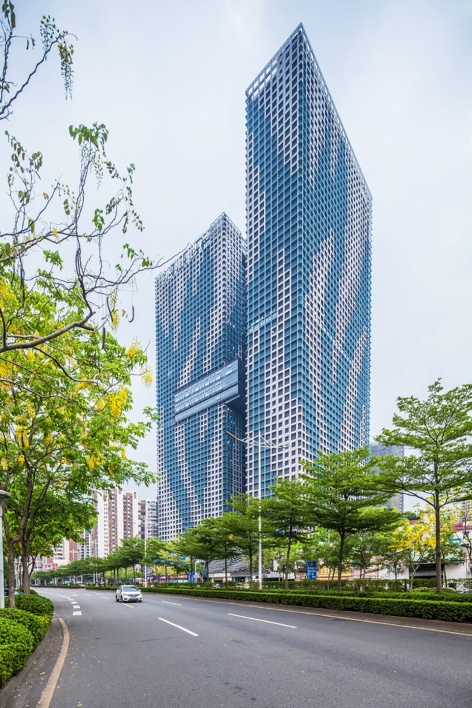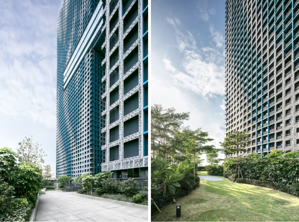 本项目位于禅城区朝安路与同济东路交汇处。区域超高层建筑稀缺,周边建筑多为高层住宅与低层厂房,周围两公里范围内有亚洲艺术公寓、岭南明珠体育馆等标志性公共建筑。考虑到周边无高层建筑,为了避免过高的天际线在居民区显的突兀,我们决定降低建筑高度通过两座的160米的“双塔”强调其标志性。为了保证每个单元拥有最佳景观视野,我们把一栋矩形平面和一栋L型平面的相对面做到最小,使其与三角形基地契合,同时可以尽量减少彼此的视线遮挡。为了打造“多首层,多临界面,多元化功能流线”的概念,我们设计了露天退台式商业内街,使人们在购物的同时享受更多的绿意与阳光。十八楼与十九楼是空中花园与走廊,在高空把两栋楼连接在一起,让人们在不同城市标高上享受丰富的空间乐趣。