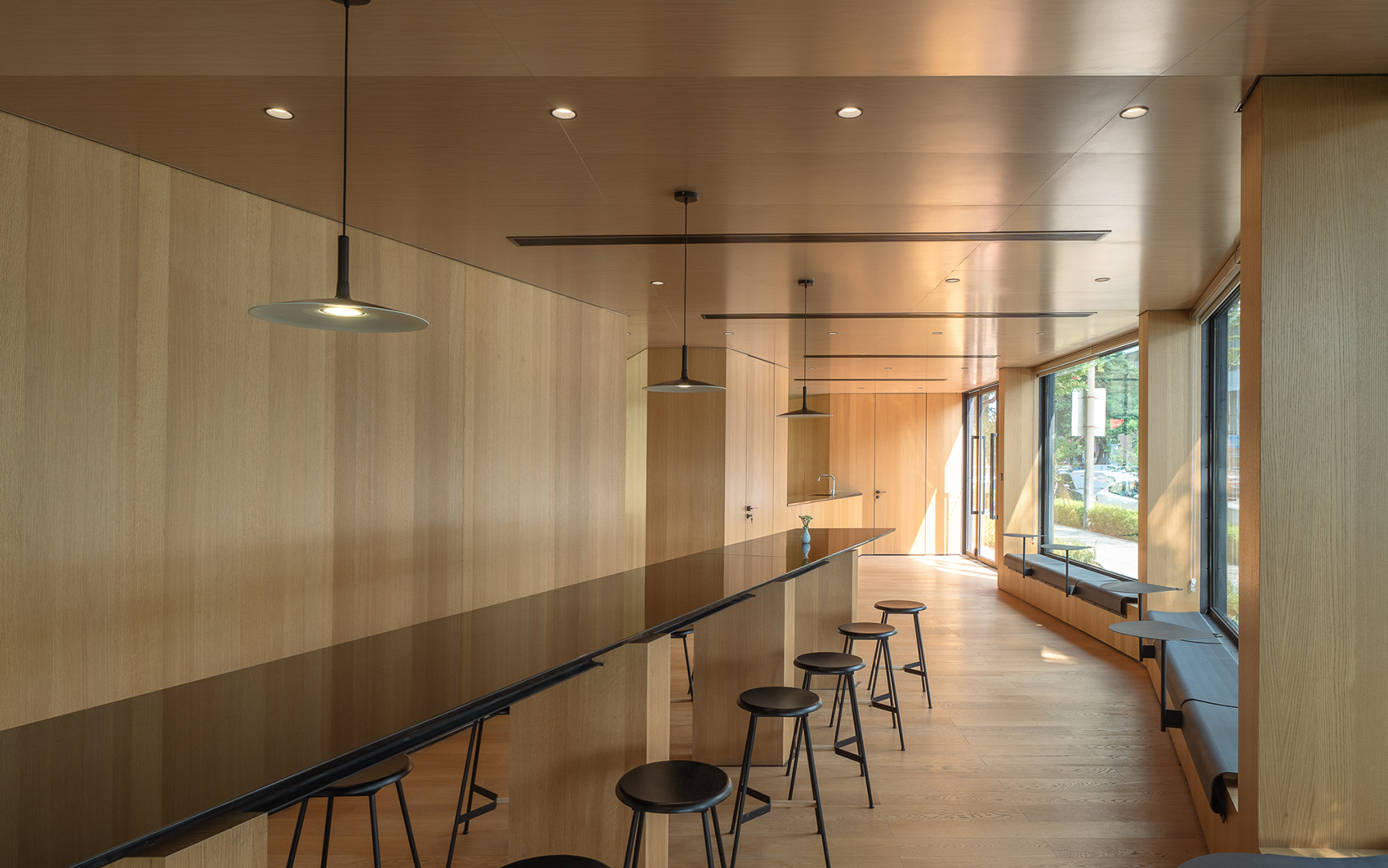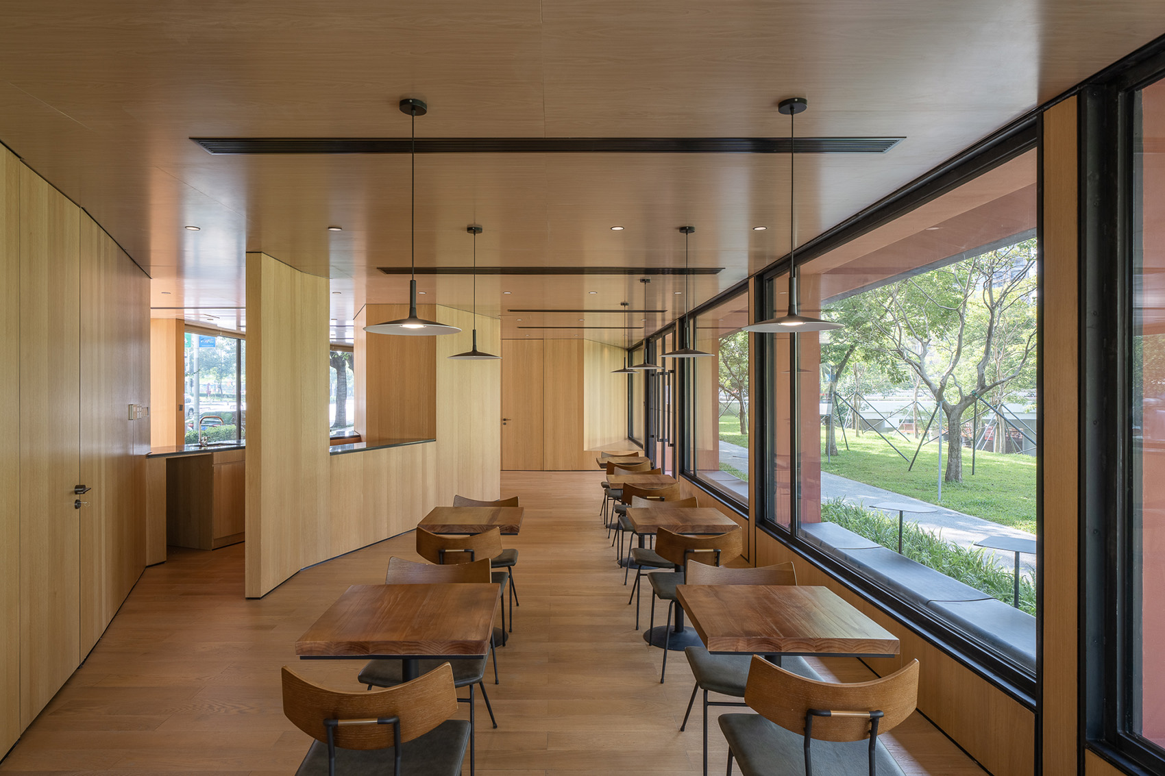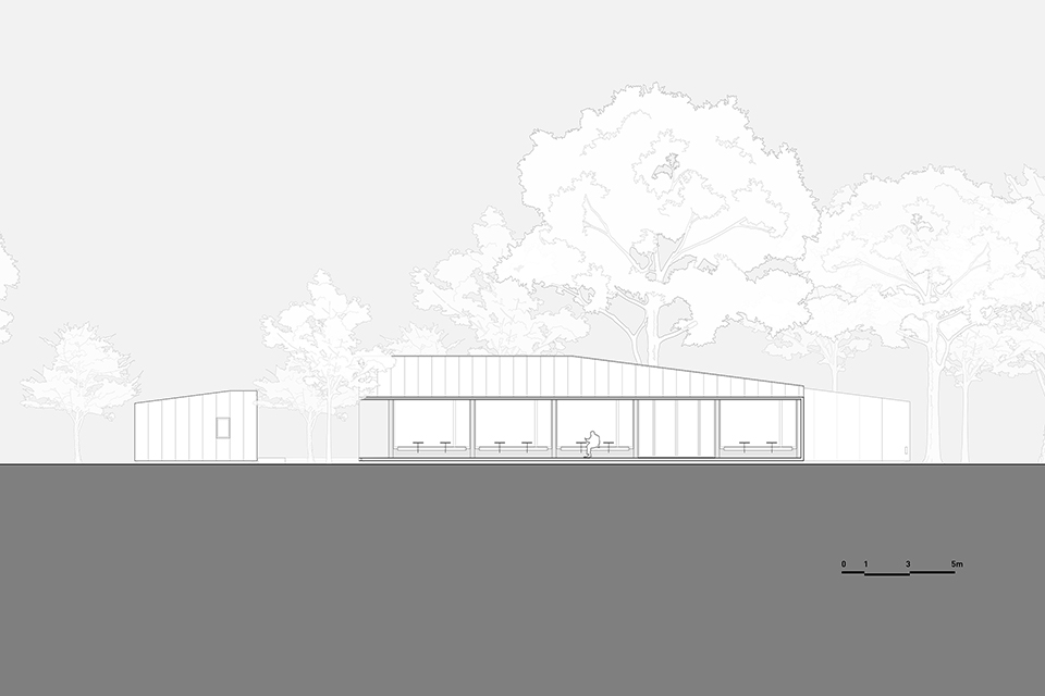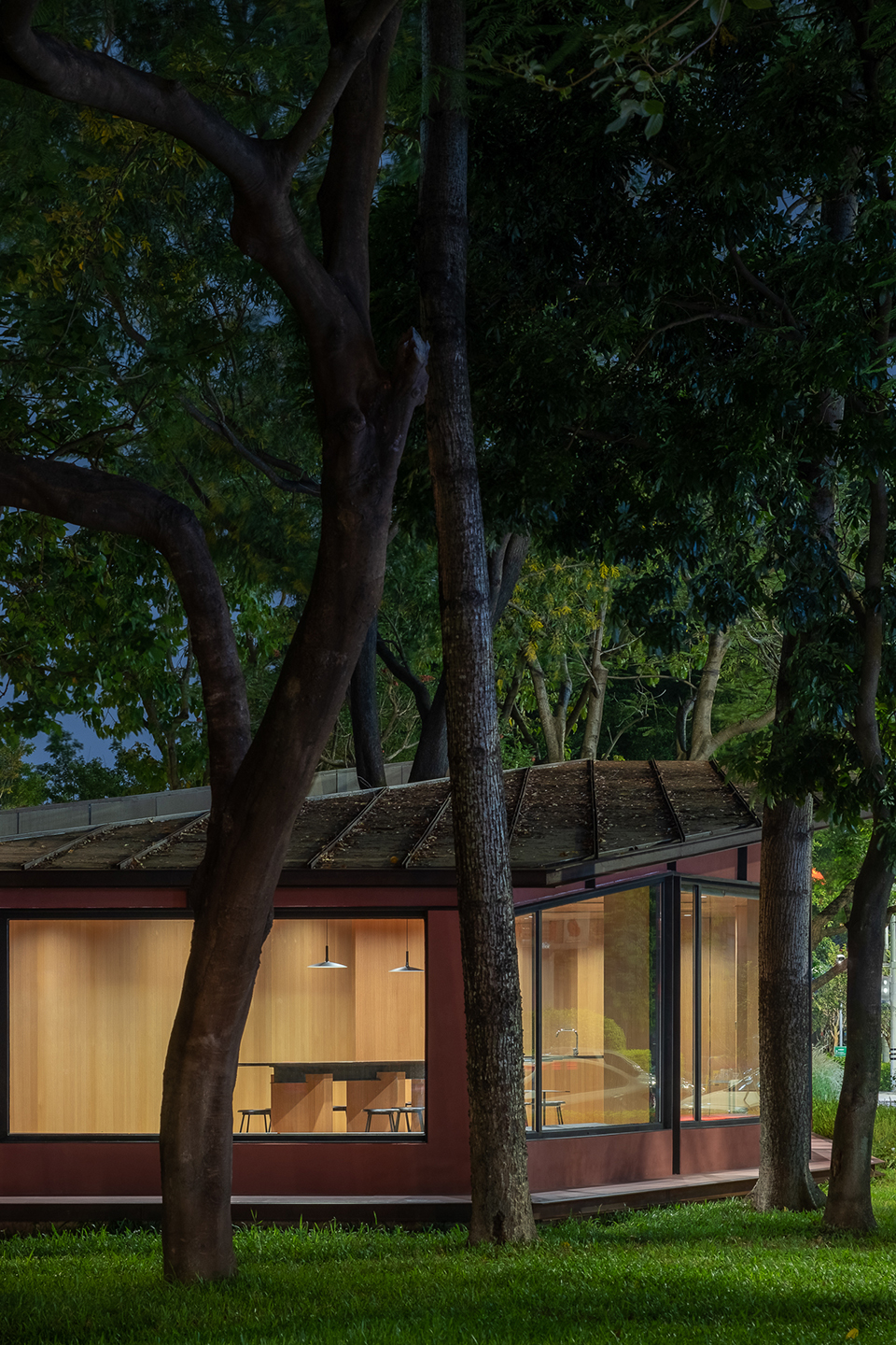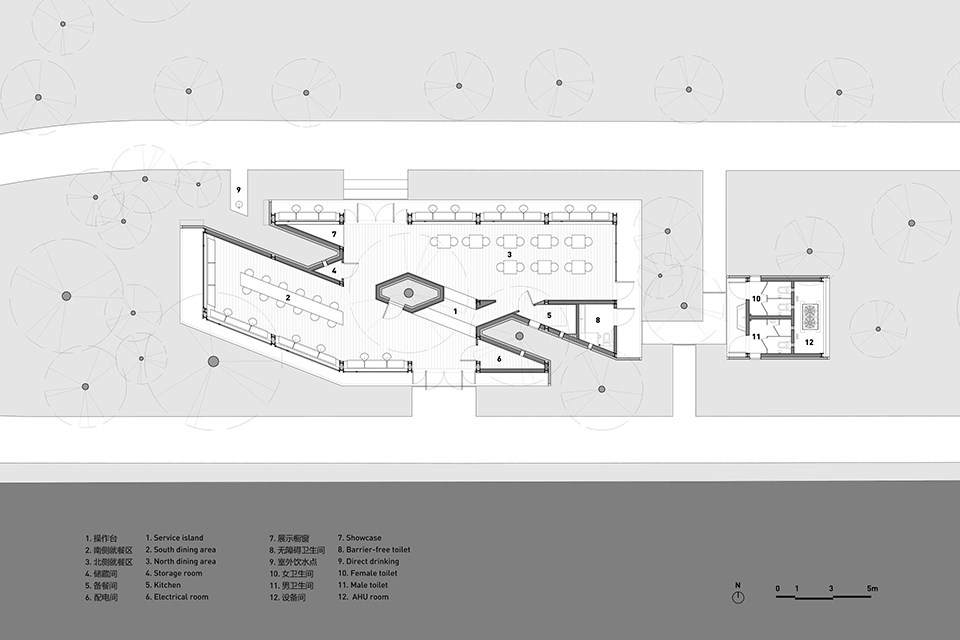 建筑的屋檐分别向南北两侧挑出,檐下的大面积阴影空间作为室内,抵抗炎热的阳光和大量的雨水。两侧的就餐空间被周边树木切割成两种比例,分别提供不同的使用方式及就餐体验:北侧空间较为宽敞均质,提供了多功能活动的可能性;南侧空间被树木挤压,呈现清晰的方向感,一张6米的定制长桌在呼应建筑语言的同时创造出聚集的氛围。