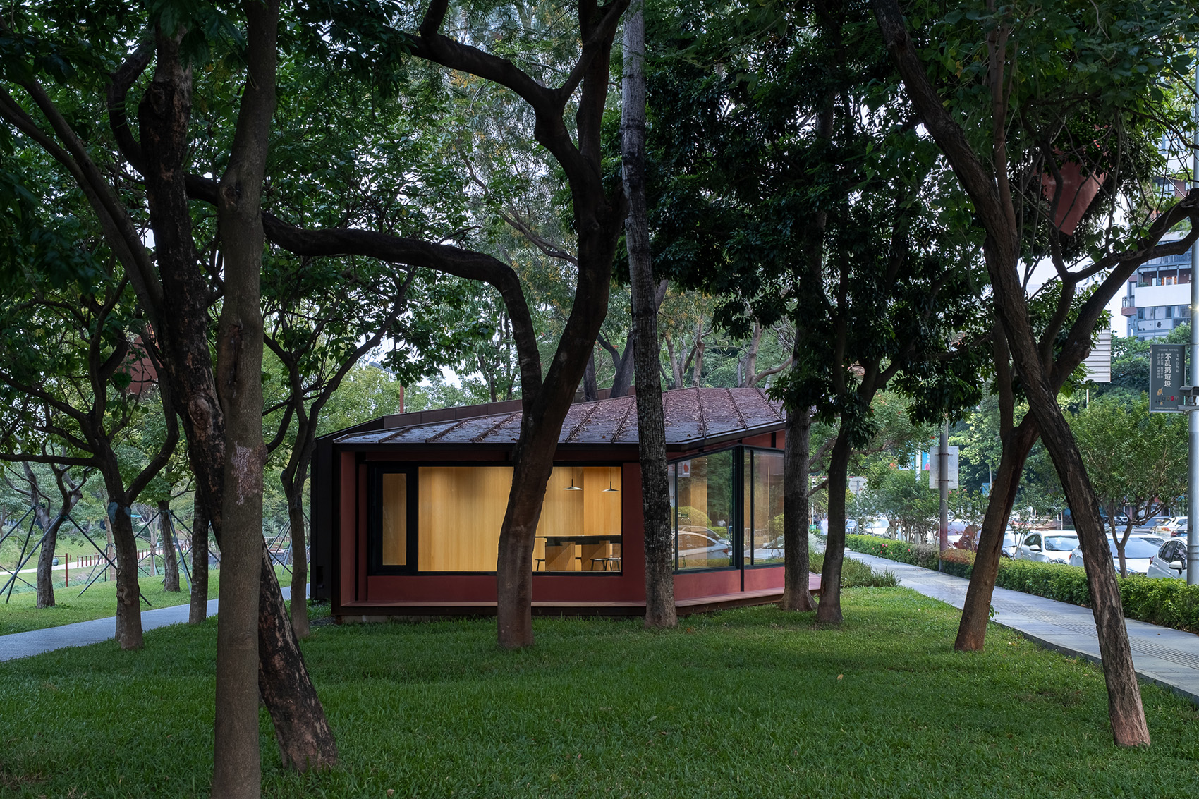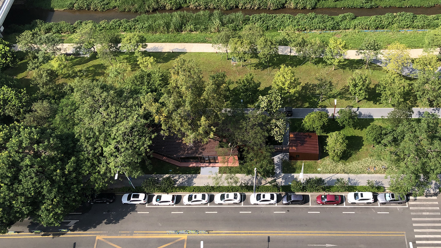 大沙河驿站的设计是一个命题作文,项目从起始就面临了两个挑战:一个关于场地,一个关于文化。首先,项目位于一片已经完成的公园绿地之中,是新增的便民服务设施。虽然我们可以在一定范围内自由选择建筑的落位,但是场地内相对密集的树木以及严苛的树木保护政策极大地限制了用地选择。其次,作为一个市政配套项目,在项目开始之前,“岭南建筑”这一主题便已确定。对我们来讲,如何用当代的建筑语言来回应一个传统的命题,也成为了项目的另一个挑战。