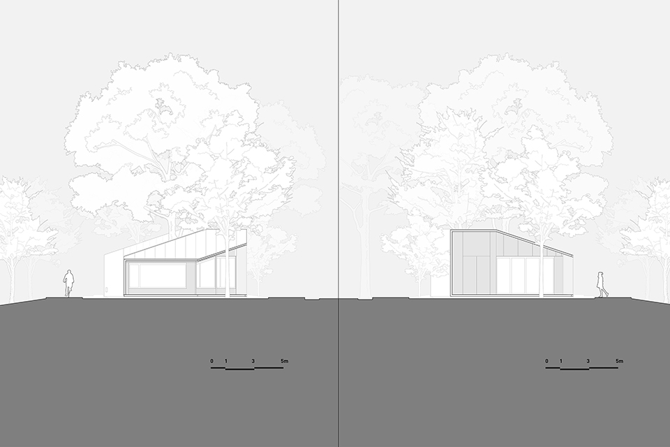 我们最终选择了场地中相对空旷的区域作为建筑的落位,三棵大小形态各异的树斜向排列于场地中央。南北两侧的道路和原生树木共同定义出建筑主体的轮廓。我们利用三棵树的位置组织实墙以及服务功能,避开树根的同时将室内面积最大化,建筑也就依势被分成了两个不同比例和大小的体量,并互相连接。
