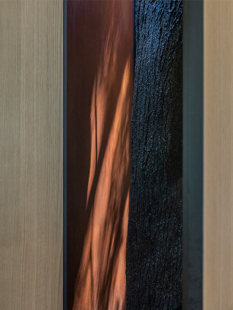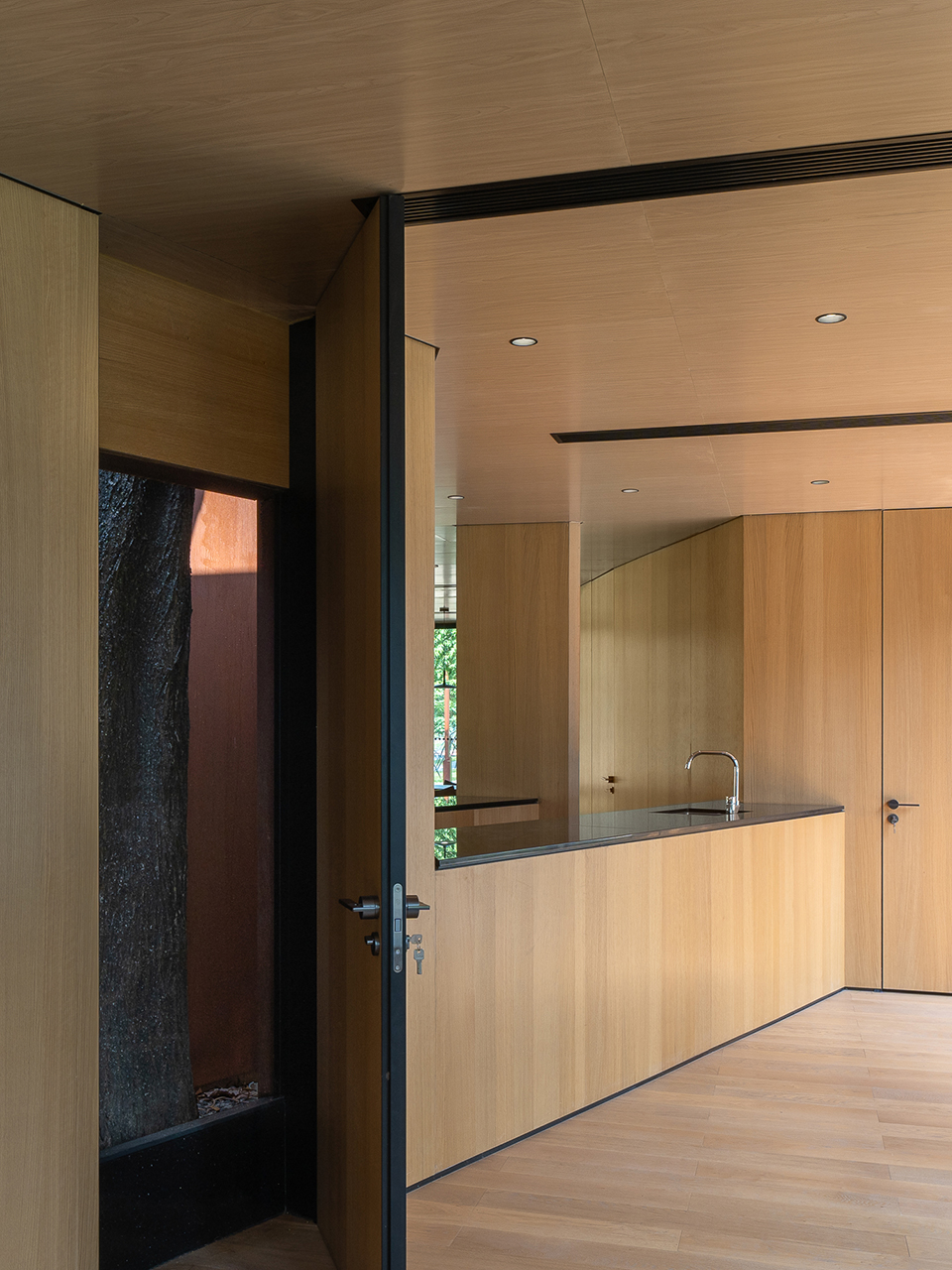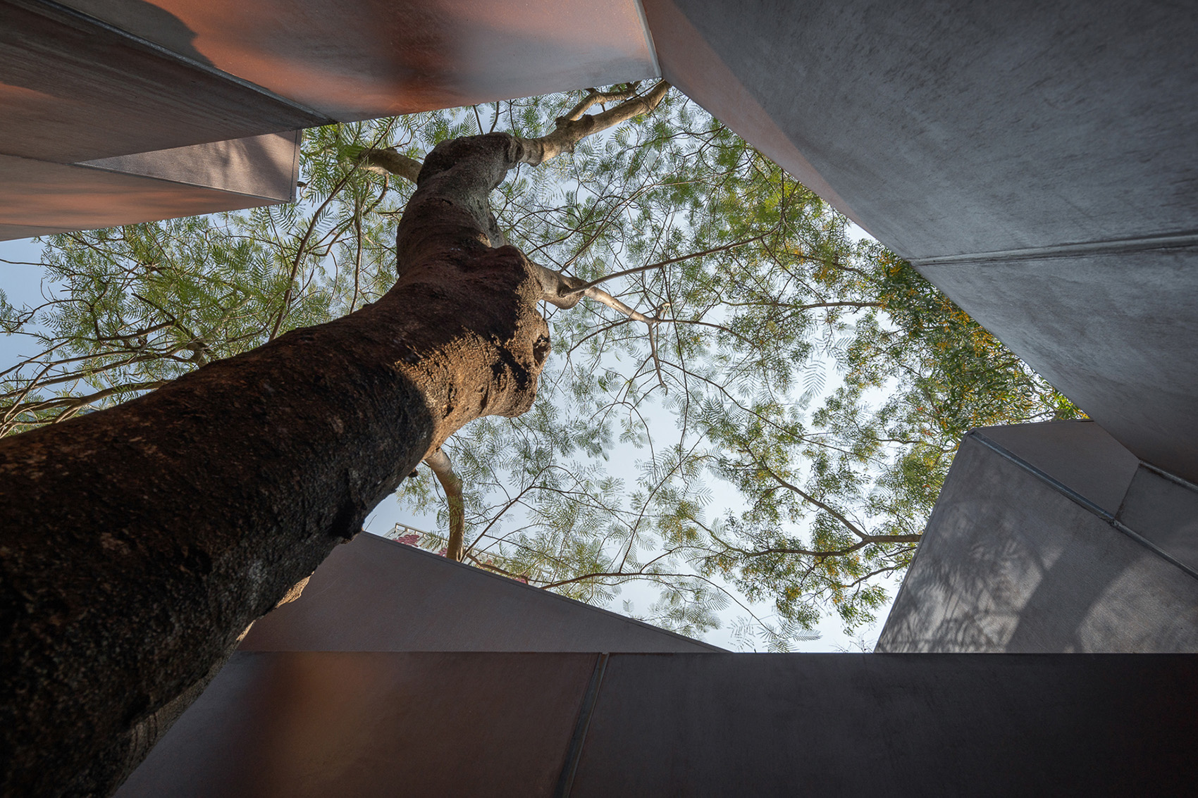 作为一个建造于既有绿地上的新增建筑,我们需要尽量减小施工过程对周边环境的影响,同时也需要应对工期压力,钢结构体系轻盈且可预制,自然而然成为最佳选择。我们选择200mm的H型钢作为基本的结构构件,其翼缘直接暴露在外形成建筑立面。在建筑面向风景的南北两侧,双柱形成的短墙强化了建筑在景观方向的空间深度,形成框景效果。同时,双柱也在构造层面解决了某些节点不同角度H型钢梁柱的交接问题。为了进一步减小建筑对于树木根系的影响,我们在树干周边设置了跨度更大的异形梁,树干周边的部分混凝土独立基础也变成筏板基础,为树根保留呼吸的空间。对于局部树冠低垂处,建筑的体量也做了退让处理。