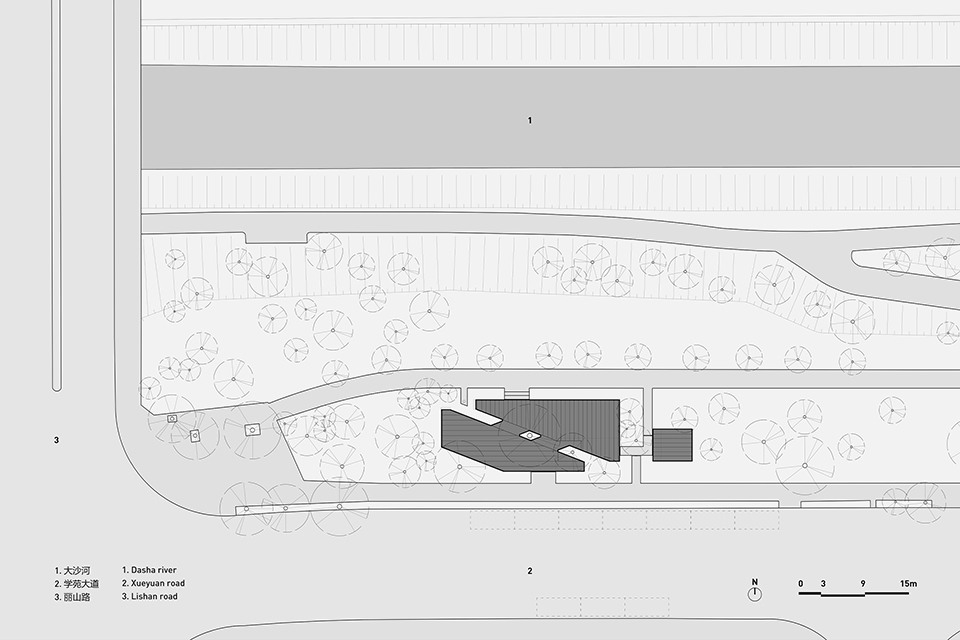不同于传统的双坡屋顶,建筑被树木分开的两个体量分别向北和向西放坡,在回应场地气候特征的同时也减小了对现状树冠的影响。这让建筑在面对不同的城市界面时展现出不同的姿态:北侧屋檐向河面低垂,风景经由结构柱所界定的窗洞涌入室内;西侧屋面向路口广场俯身,以漂浮的姿态掩映于树木之后,让建筑纳入风景的同时也成为风景。