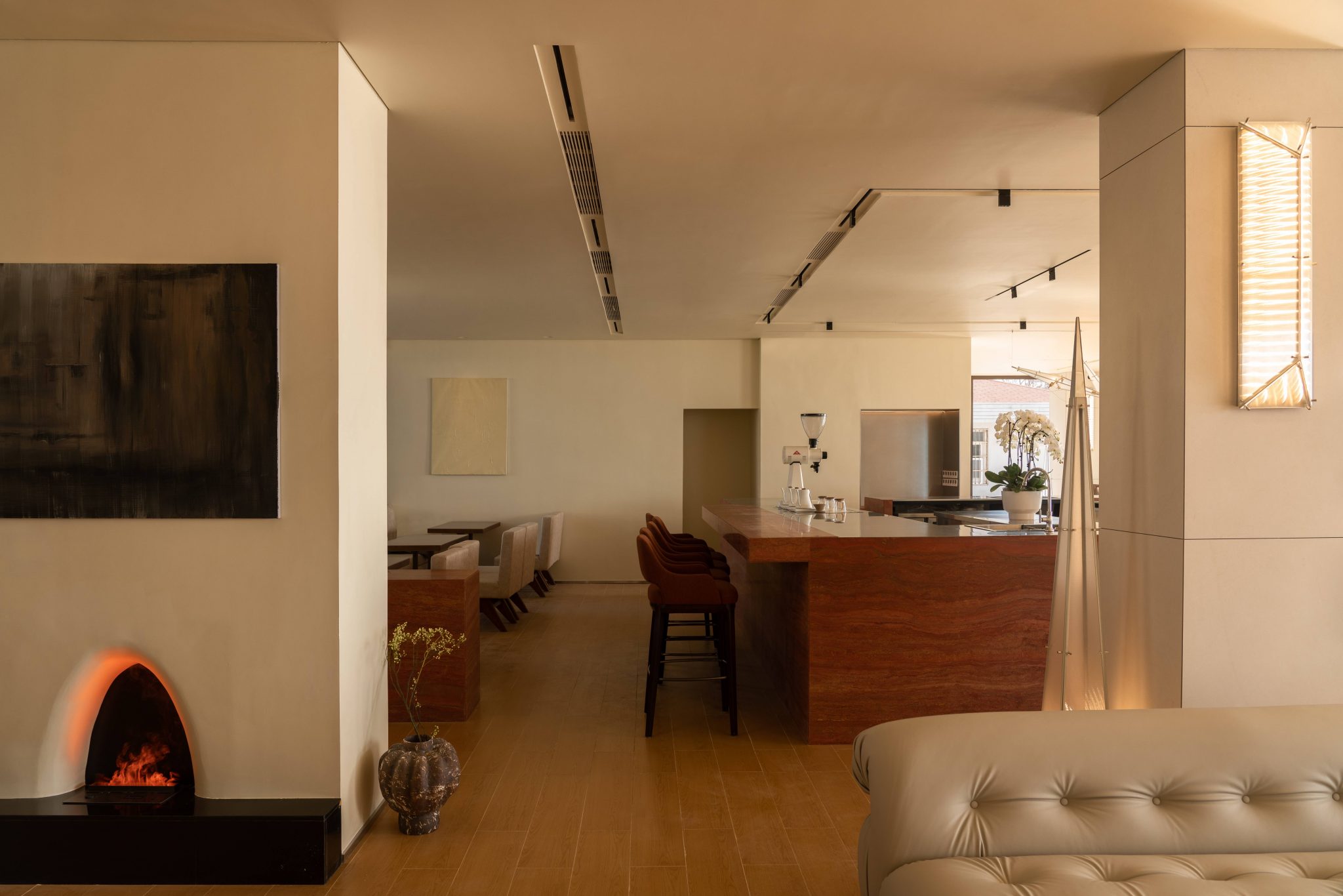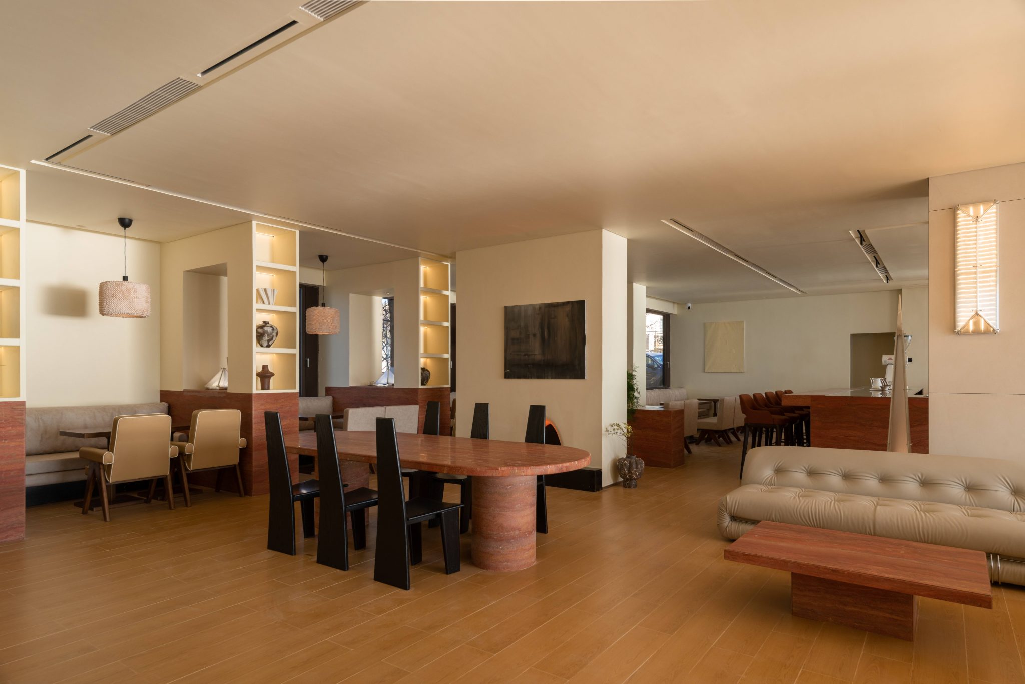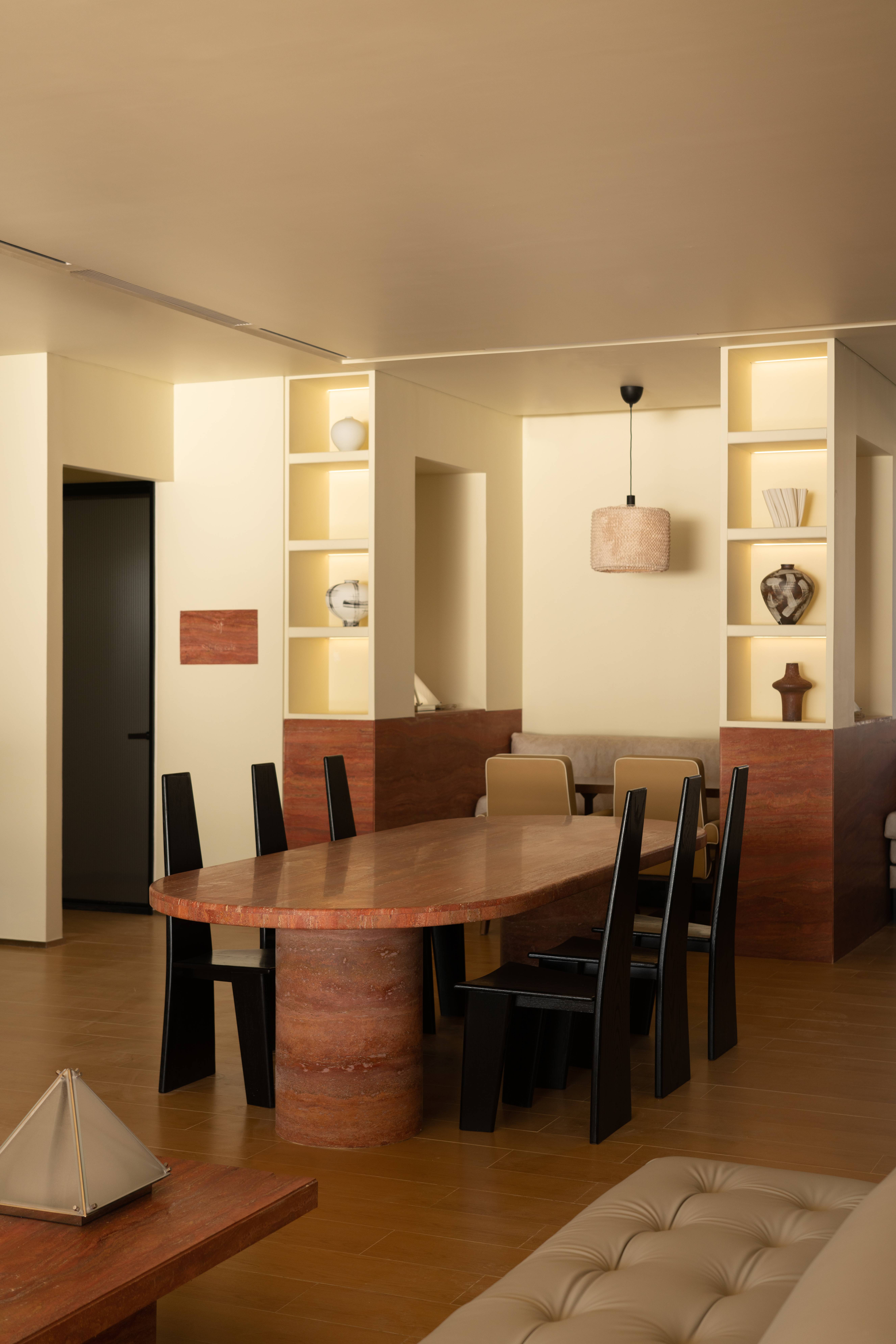 进入到室内,仿佛一场优美的家具交响曲,红洞石材料需要经过多次的打磨处理,才能呈现出现在的致密结构、以及磨光性超群、色调柔和雅致同时又具有流畅自然的石肌理。