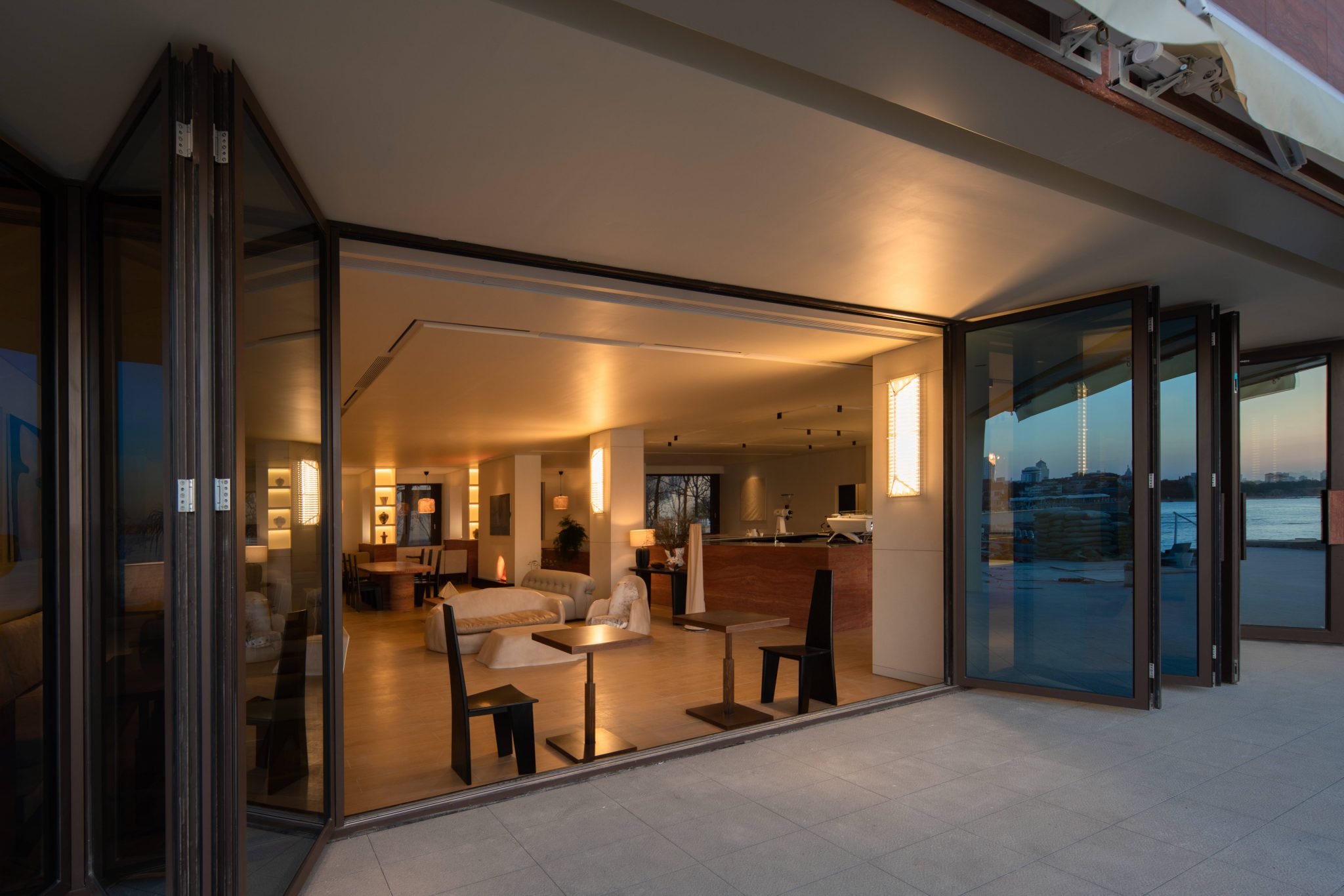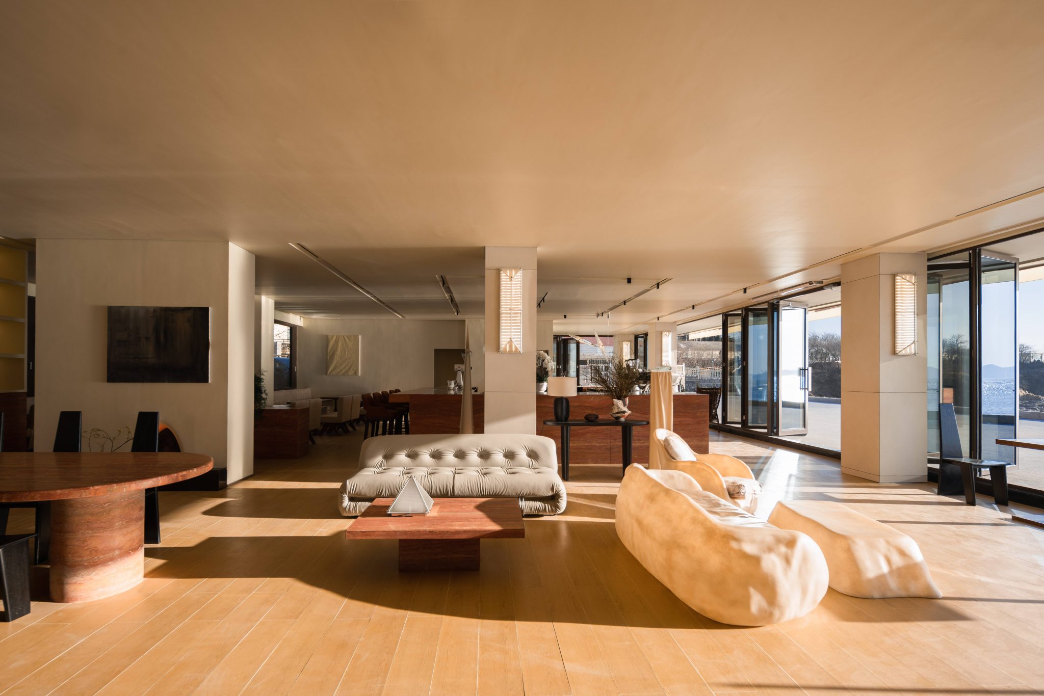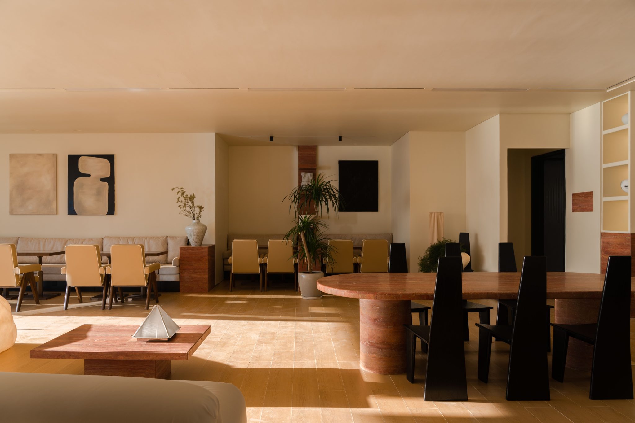 进入到室内,仿佛一场优美的家具交响曲,红洞石材料需要经过多次的打磨处理,才能呈现出现在的致密结构、以及磨光性超群、色调柔和雅致同时又具有流畅自然的石肌理。