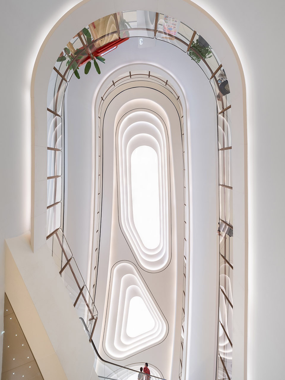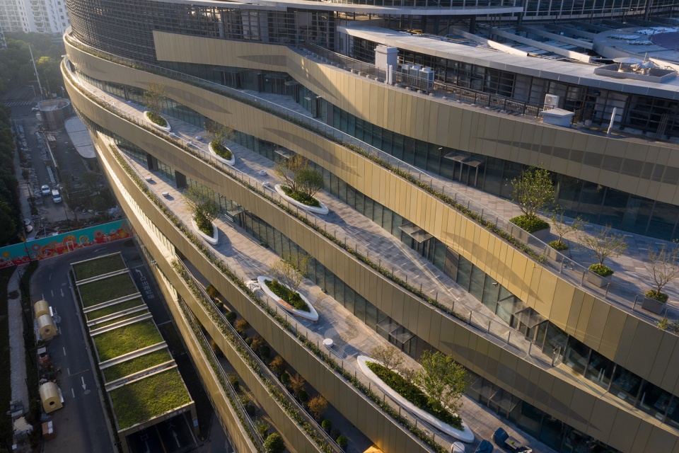 整个建筑的形体下凸上凹,而外立面飘带般的立面装饰更强化了这种曲线的造型。建筑远观仿佛蜿蜒的山脉或是交叠的梯田。建筑层层退台、层层变化,不仅削弱了建筑的体量感,也创造出丰富的室外露台空间,提供了更多的外立面绿化。借此,生态自然的景观延伸到每个楼层,和超大中庭的室内花园也形成联系、相互呼应。