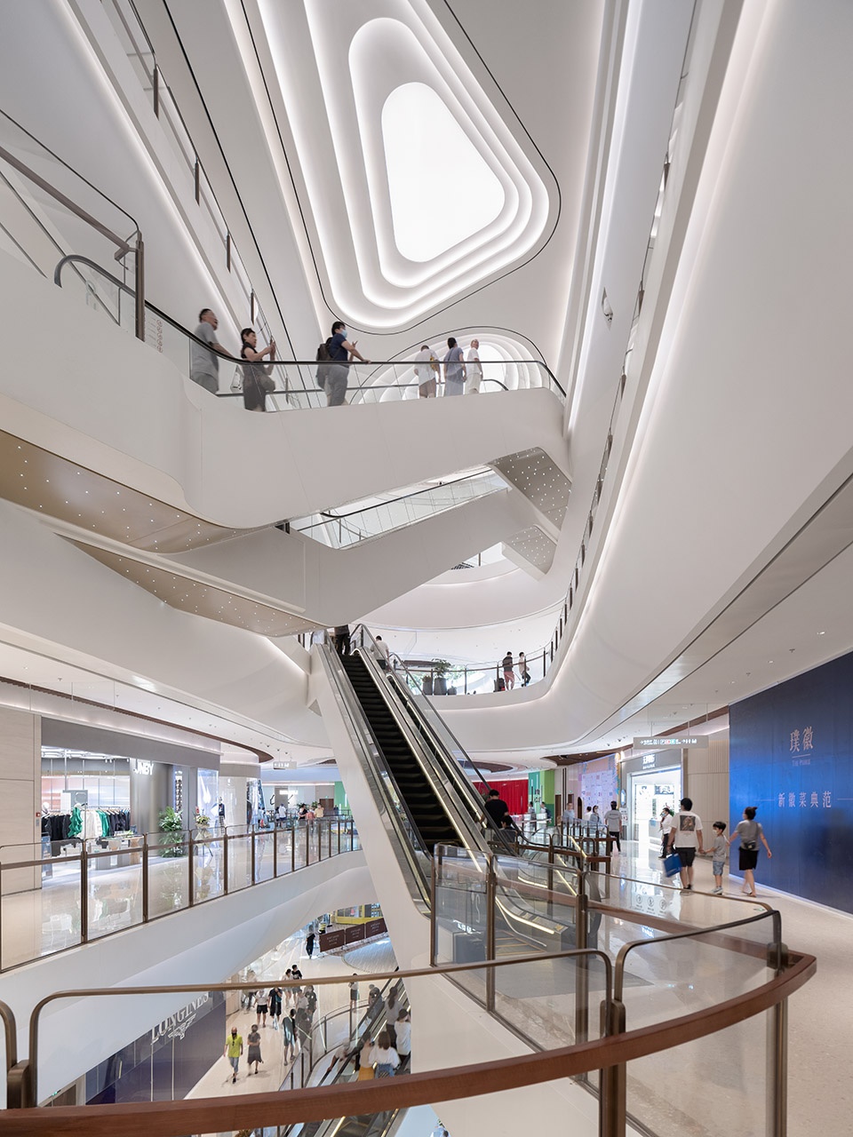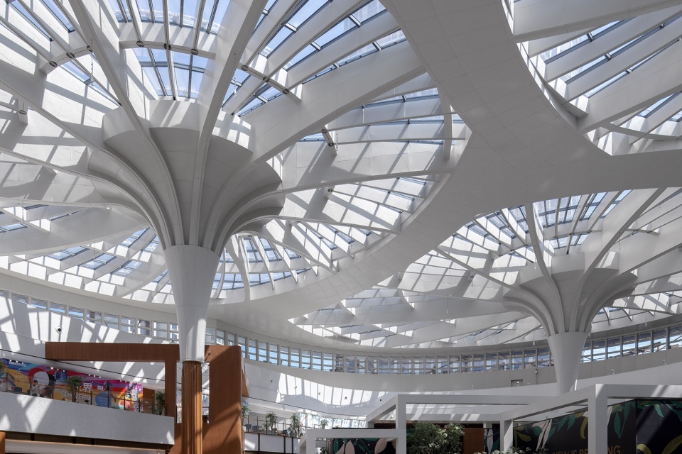 作为整座建筑的焦点,主题街区三层挑高的超级中庭拥有5,500平方米的超大采光顶——巨大的采光顶犹如三片荷叶,而三根立柱仿佛参天大树般将它托起。伞状的柱体不仅从体态上减弱了整个空间结构的厚重感,更从造型上进一步强化了生态自然的设计理念。同时,采光顶还采用了根据阳光而变化的自适应遮阳系统,以实现室内空间的节能环保。采光顶之下,则是一处开阔的广场——在此,大小不一的体块互相堆叠、错落有致,在绿植之间虚实掩映,营造出了轻松自然的街区式商业氛围。