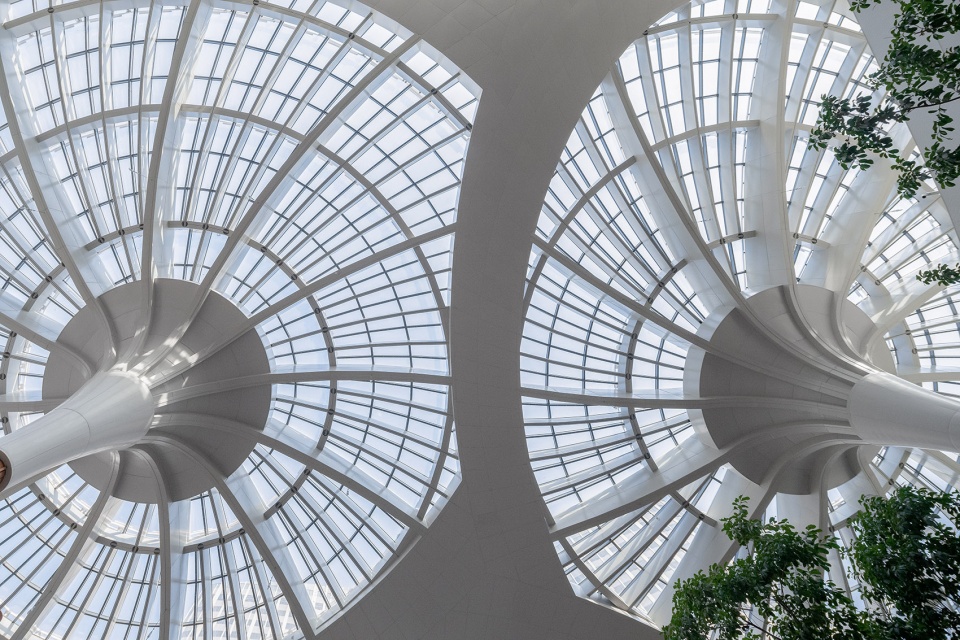 整个天幕是一座跨度88米的大型钢结构——根据造型设计,其每一根曲线结构杆的大小、长短、弧度都不尽相同,因而呈现出三片似而不同的“荷叶”,并组合出了抽象的形状,以向外发散的螺旋曲线形成了独特的韵律。同时,机电等设备设施则隐于天幕外围波纹状的白色格栅之中,使得第五立面完整洁净而又优雅和谐。