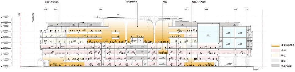 在商业业态上,如此大而特别的空间打破了传统商业建筑中对空间进行切小分租的模式,将更多的业态与体验融汇其中,为整个空间赋予了更多的灵活性与可变性。而在商业运作机制上,设计巧妙地利用了建筑中下层商场中的中岛区,将连通后勤货区与5层街区的垂直交通系统隐于其中,既满足了位于高层的大面积餐饮业态所需的生鲜运送、物流、维护等需求,又将中岛空间在顶部进行了转变,实现传统商场空间的功能升级。