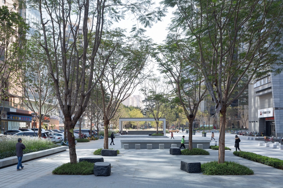 2021 年 2 月,经过近一年的整治提升,由 AUBE 欧博设计完成的东莞广发片区城市品质提升工程全面建成。该项目是东莞中心城区“一心两轴三片区”范围内街区式人居环境品质提升的首个示范项目,塑造了一个充满活力、生态自然的城市公共空间。东莞广发片区位于东莞市行政中心东侧,占地约 11 公顷,由 4 个住宅小区、3 栋商业建筑构成,是贯通东莞市中心广场、黄旗山、会展西绿地公共空间廊道的关键组成部分。作为东莞城市公共文化、城市商圈和绿色生态廊道的联系中心,广发片区具备城市公共性与连接性的双重特点,是推动东莞中心城区品质提升的核心区域。