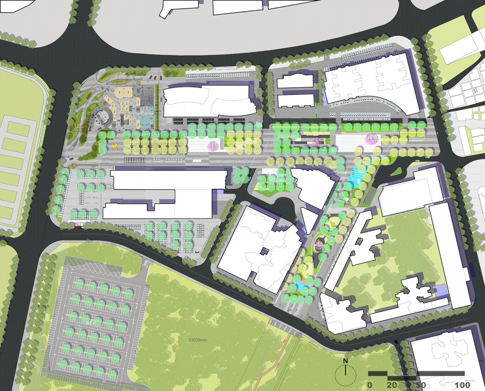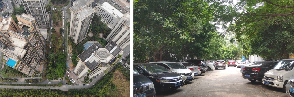 东莞广发片区城市品质提升工程改造面积约 8 万㎡,其中道路面积约 2 万㎡,景观面积约 6 万㎡。AUBE 欧博设计连同代建方东莞市万科房地产有限公司,对片区公共空间绿化、铺装、城市家具以及人车交通空间进行全面深度的整治提升,建设具有特色的人性化城市公共空间。广发片区内社区建成多年,改造前因缺乏统筹管理,公共开放空间被凌乱的停车和设施占据,绿化植被杂乱、市民出行不畅、商业萧条,环境品质并不高。为优化片区路面停车,实现人车分离。设计团队与交通顾问重新统筹规划了广发片区的停车流线和路面停车,于片区西北角修建含 378 个停车位的立体停车楼,缓解片区内的停车压力。同时优化慢行流线,营造一个人车分离、适宜慢行的城市活力空间。