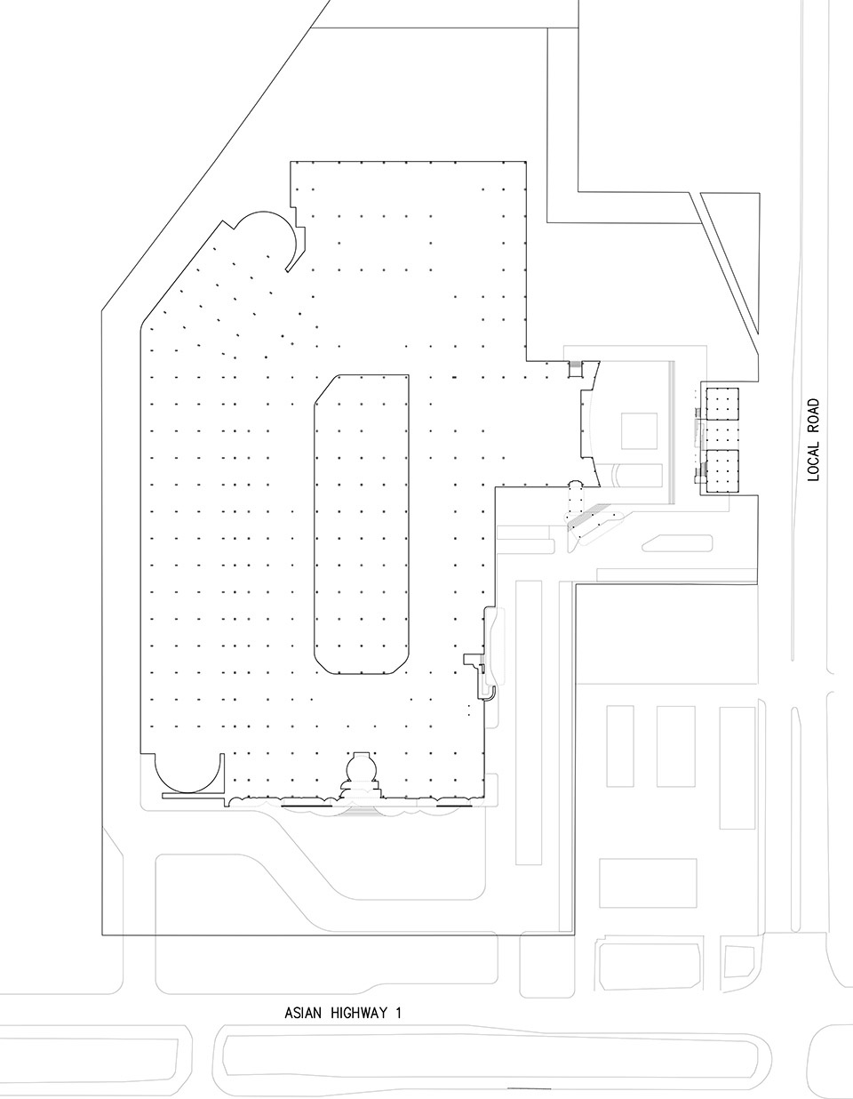 粉刷成白色的主要预制混凝土墙才是建筑真正的外墙,除了新添加的chom hae几何元素外,墙面上没有其他任何装饰。与双层表皮相比,这种设计有助于降低建造成本。除了面向亚洲1号高速公路的主入口立面外,购物中心落客区的天花板与凹墙也采用了相同的设计元素。落客区天花板所采用的材料与主立面相同,均为金色铝板,旨在在这座大型购物中心中强调出这种全新的几何装饰元素。