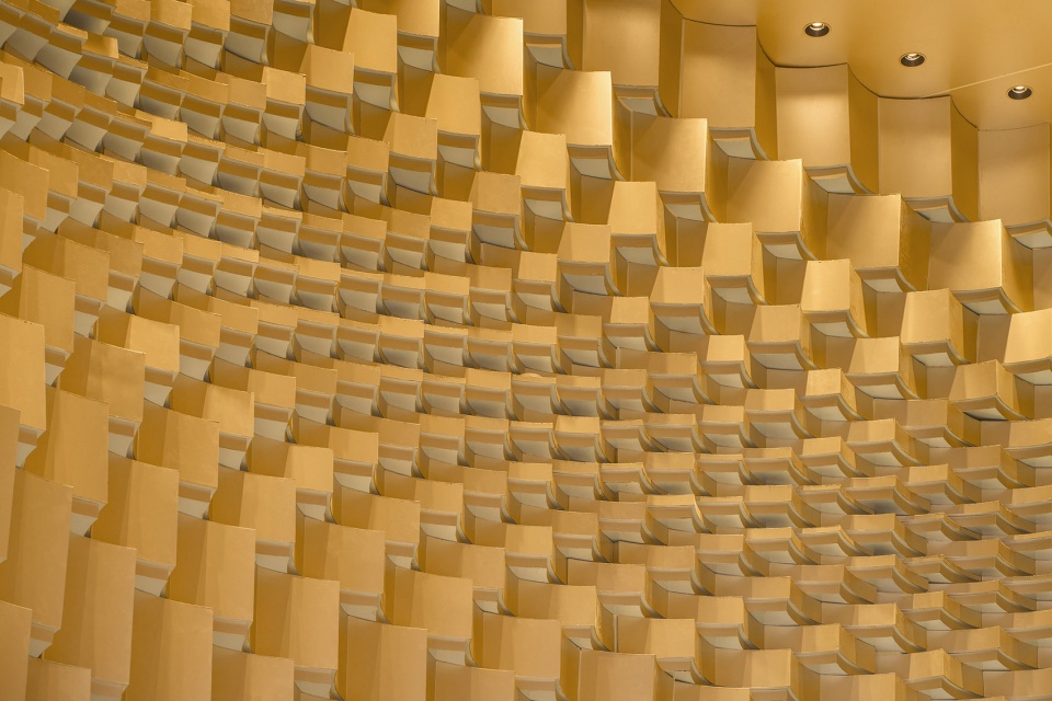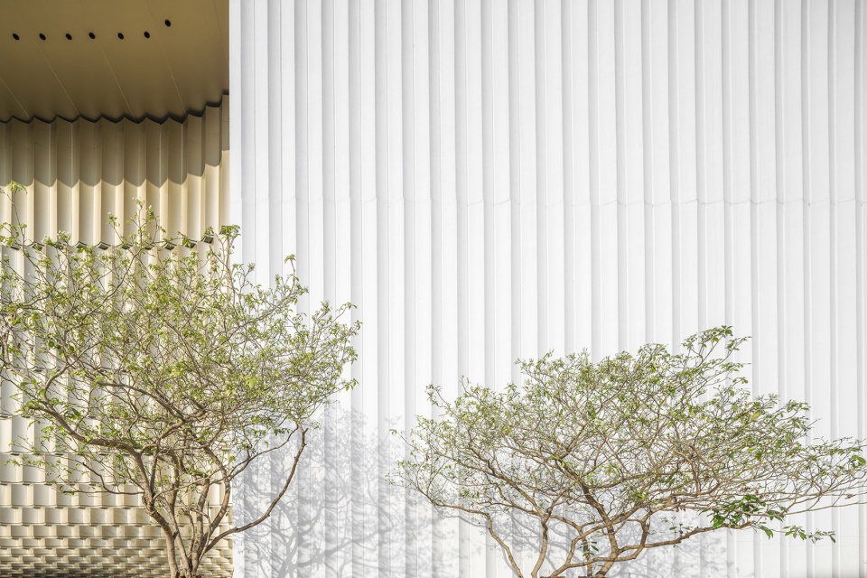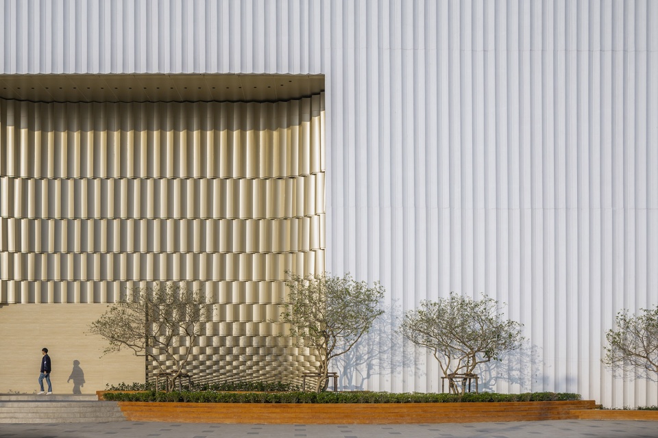 ▼白色混凝土墙上的竖向肌理呼应了主入口的金色几何元素