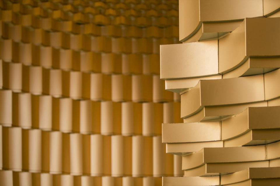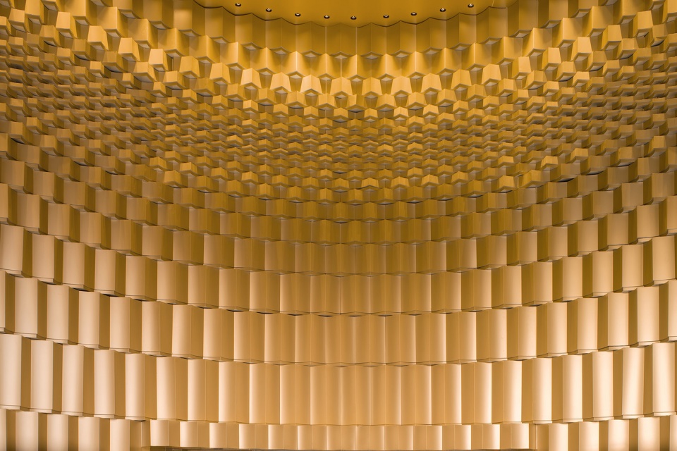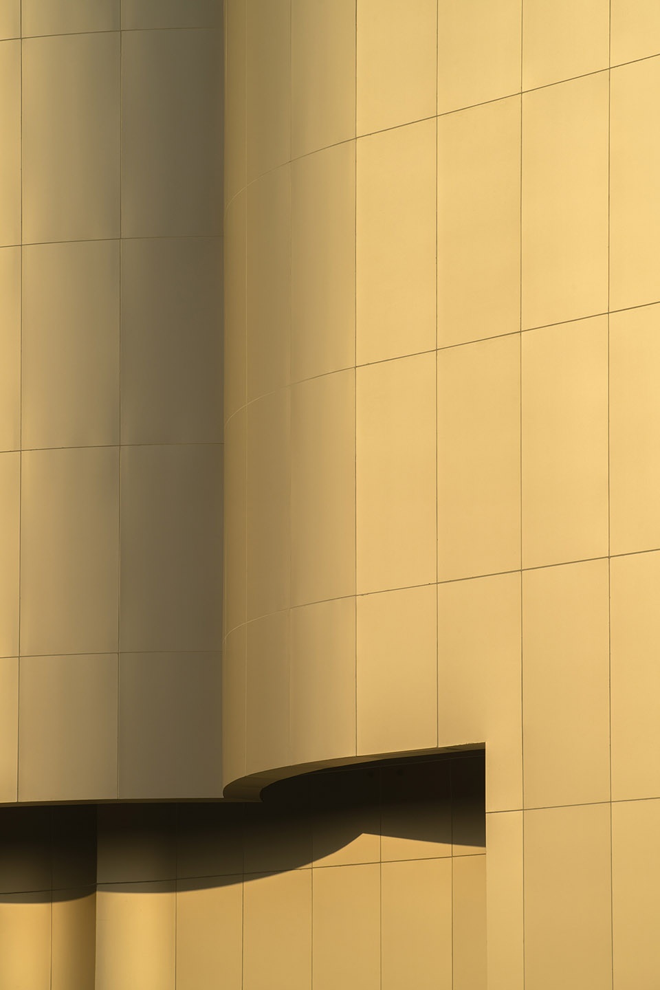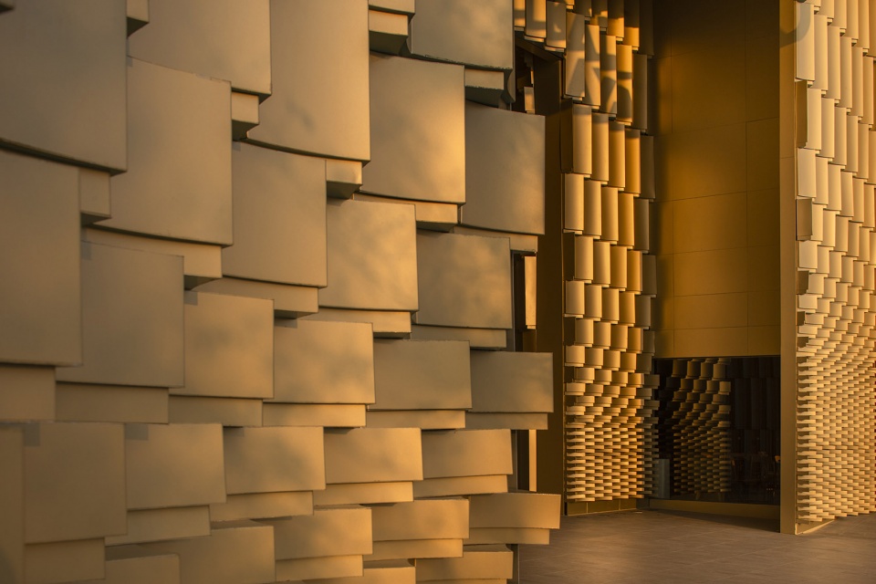 几何模块的渐变是为了在立面凹陷处营造出三维空间的效果,将人们的注意力从建筑尺度吸引到人体尺度。铝板模块的尺寸越靠近地面就越小,这种变化在立面的凹陷处最为明显,产生出富有新鲜感的视错觉。这种建筑模块的层次变化将人们的感知引导到主立面上最小的空隙上,也就是白色预制混凝土墙与金色凹墙的交汇处 —— 购物中心次入口。
