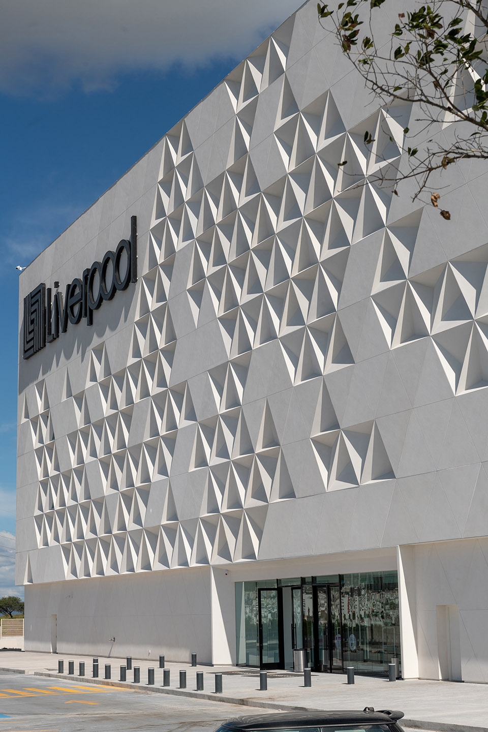 项目位于墨西哥Santiago de Querétaro市的Paseo Querétaro购物中心。立面由平坦和浅浮雕的三角网格模块构成,形成一个简化的偏心金字塔形状。当这些模块部分被旋转使用时,就可以产生三种可能性,能够相互组合并产生无序的纹理。这个立面在一天中不同的光照下产生阴影和反射变化。立面由金属框架和白色预制混凝土构成。