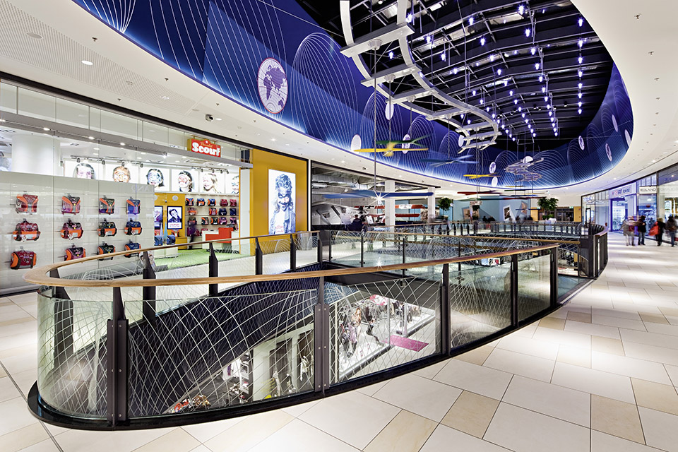 漫步购物中心环道 ,顾客可在购物中心中体验四种不同的设计空间。商场的室内设计引用了航空发展史的元素,并以早期飞行、黄金时代、喷气机、现代航空为副主题,通过红、黄、蓝、紫四个副主题色,结合照明,将购物中心划分为四个区域。六米高的购物中庭犹如教堂礼堂般的空间感,积极渲染出两侧零售区域的魅力。墙面及地面中的螺旋桨、机翼、舵盘、悬翼元素及无处不在的平面设计,将顾客引入独特的购物体验。