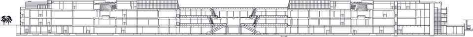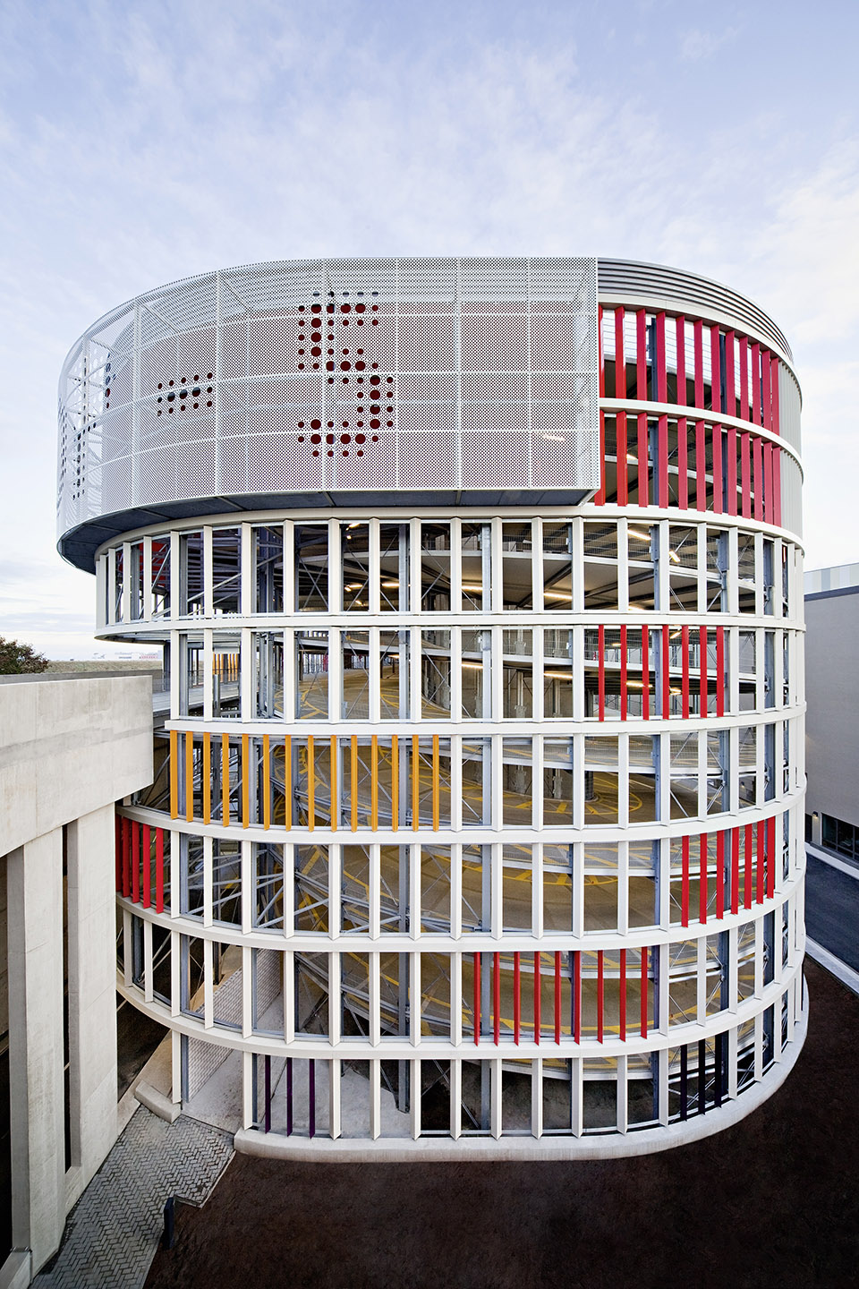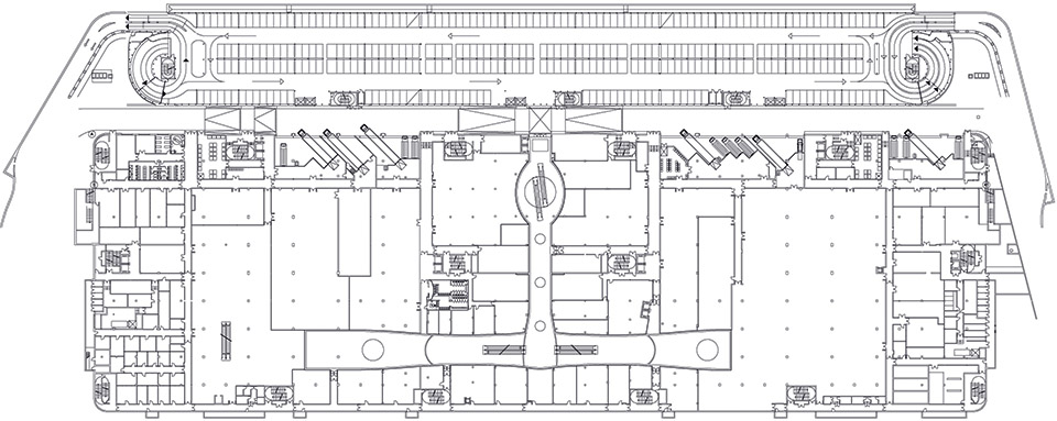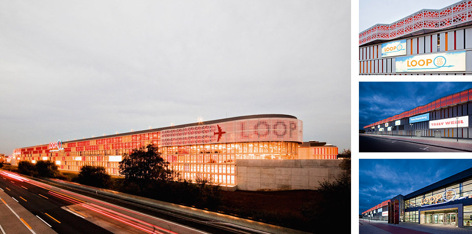 320m x150的LOOP5由主体购物中心建筑和可容纳3000辆车位的9层停车场组成。购物中心共为4层,包含地下1层,和退进8米的屋顶夹层。停车场位于购物中心前部,紧邻高速公路。两座建筑物由通行桥梁连接,并在地下设有附加通道。建筑立面中的弧形转角和垂直纹理幕墙在视觉上将两座单体连为一体。