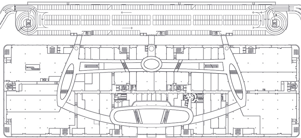 大部分顾客将经由A5高速公路开车抵达购物中心停车场。除连接停车场与购物中心的两条通道外,行人也可通过主入口进入。LOOP5是一座环形购物商场,除地下一层为T形布局,设置超市、电子产品商店、技术服务和交付区。三组自动扶梯连接起商场的垂直通行,其流通布局路线触及到购物中心的各个角落。整座建筑共提供175个25m²至3420m² 的零售单位,1430m²的美食广场,及1200m²的休闲娱乐设施。餐饮区位于二楼中庭,通连屋顶夹层。