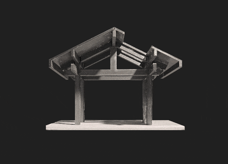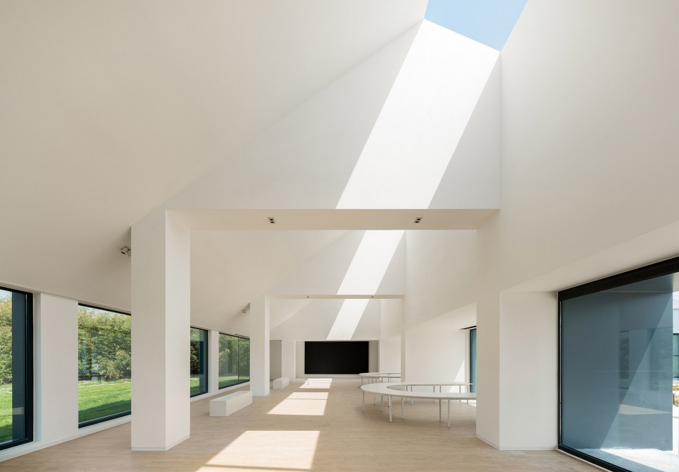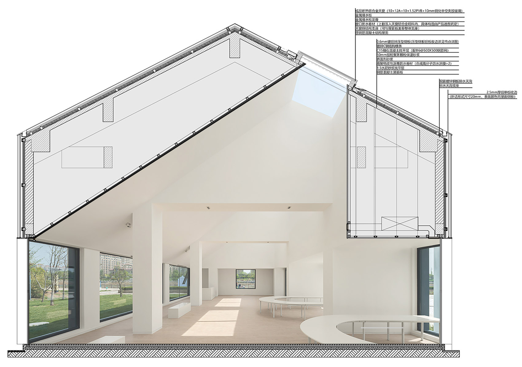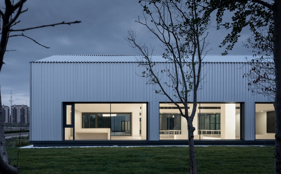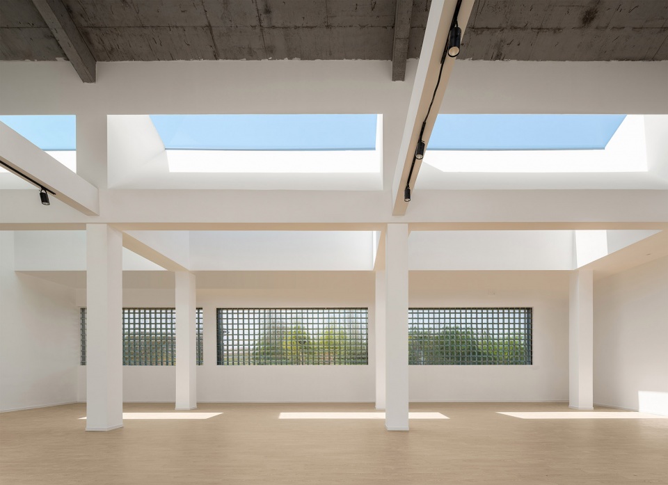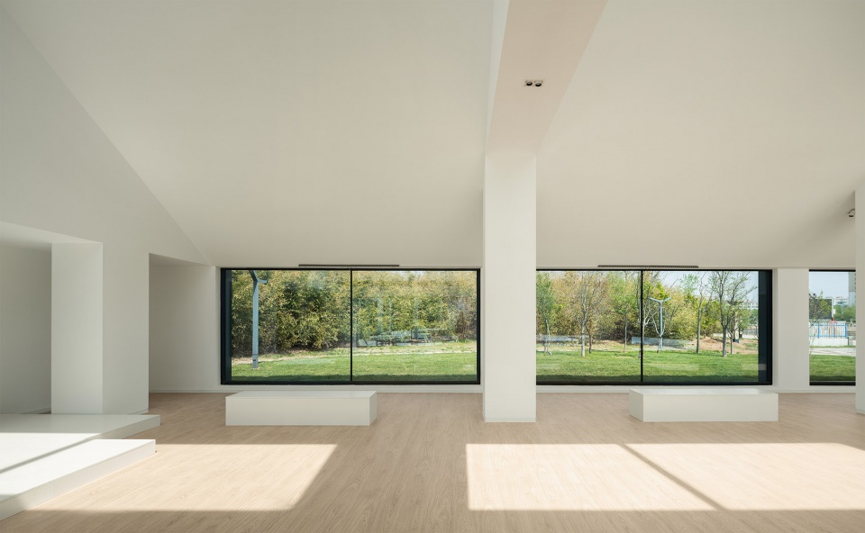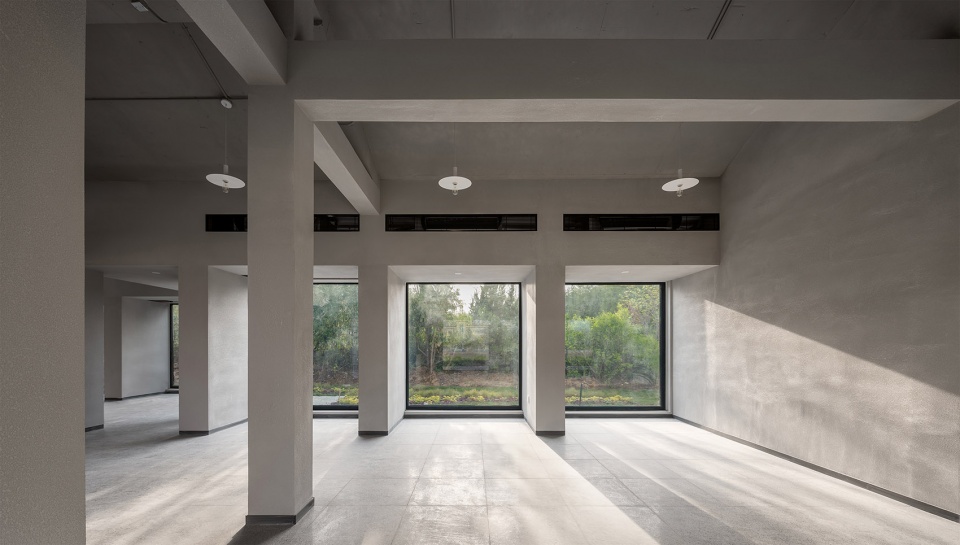 原有建筑风格形制下,内部空间比例高耸、使用效率低,结构体系横梗其中。于是设计在2.5米高的结构下缘引入控制线,将室内划分为上、下两部分: 2.5米以上引入天窗及机电设备, 2.5米以下设置窗将室外环境引入室内;2.5米处的吊顶线引导水平视线沿河岸伸展,更直接地将室内与沿河景观联结起来。天窗引入的光与被包裹的体块化的结构一起形成光的容器。光线穿梭在梁架之间,赋予了旧空间新的空间体验。