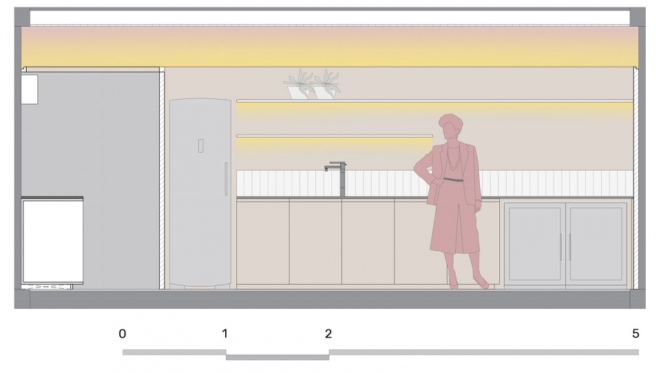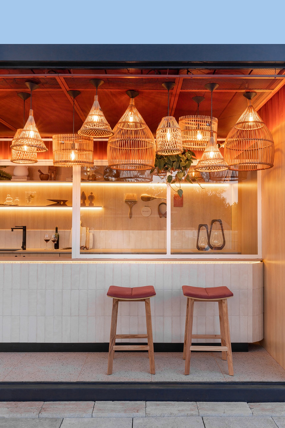 酒吧内置于尺寸为 6mx3.75m的金属模块中,四个侧面中三面封闭,内部铺设金属纹瓷砖。为了保护外壳,设计明确规定内部元素不能固定在墙壁上,也不能固定在准备区和服务区之间的弯曲木墙上。建筑师希望打造一处受欢迎、有吸引力的动态空间,既能够适应繁忙的日常营业,也可以避免人与人之间的身体接触。