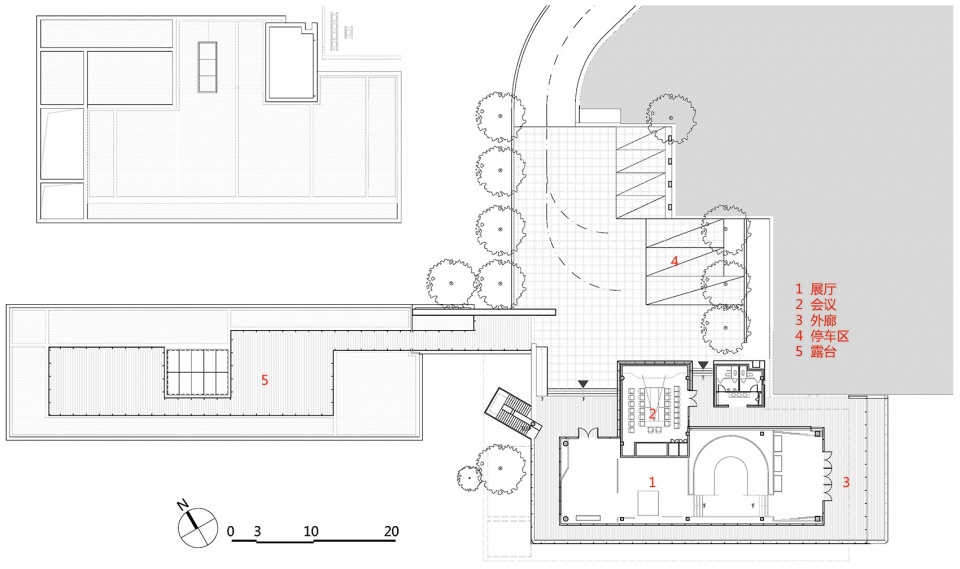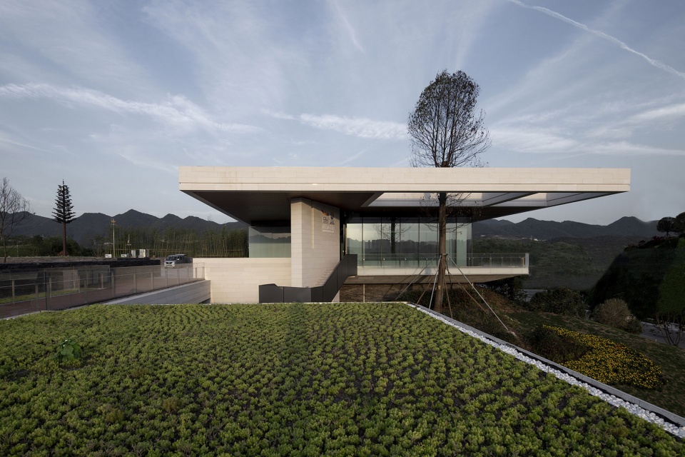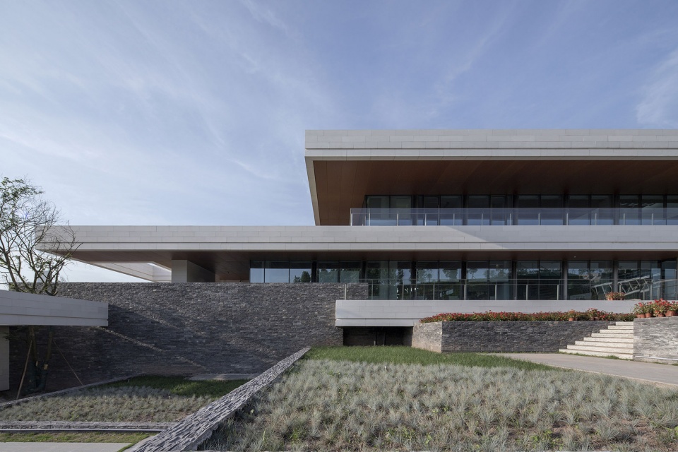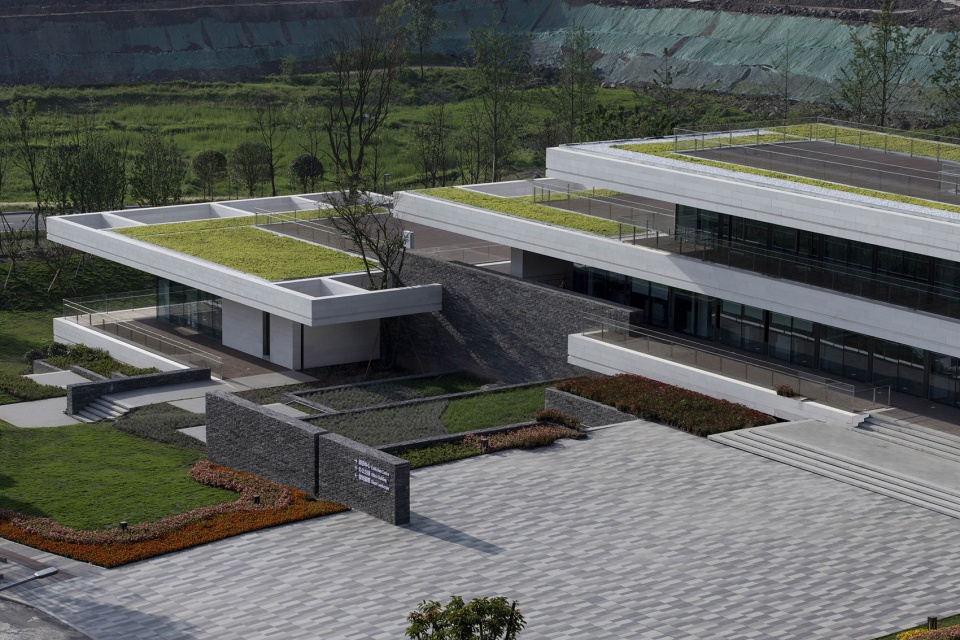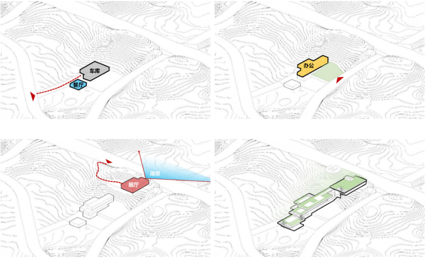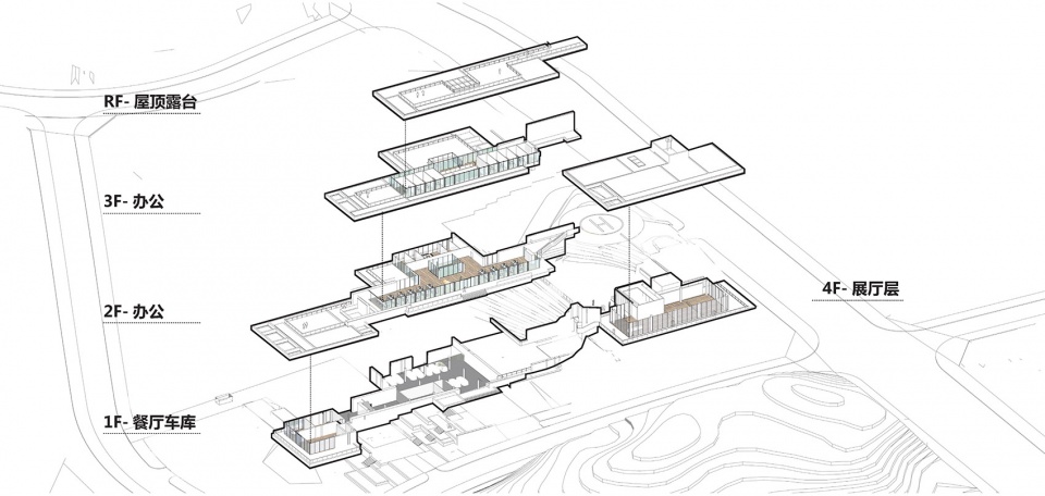 我们将餐饮服务,办公,展厅三个功能组团根据功能属性,沿山势标高错位布置,最大限度减少土方调整,同时每个功能组团景观视野互相不遮挡,下一层的屋顶同时也是上一层的平台。