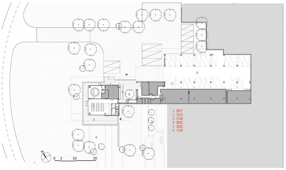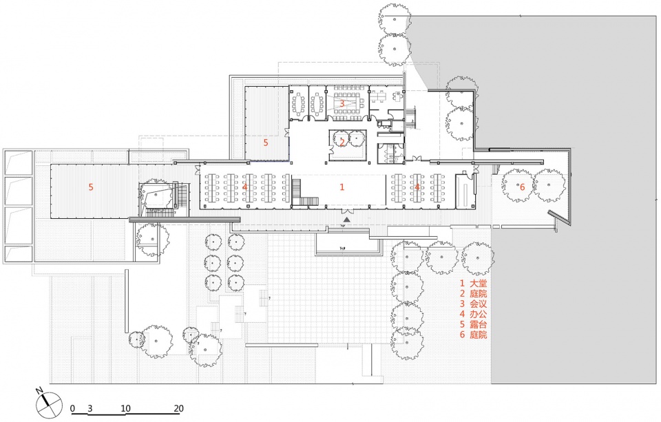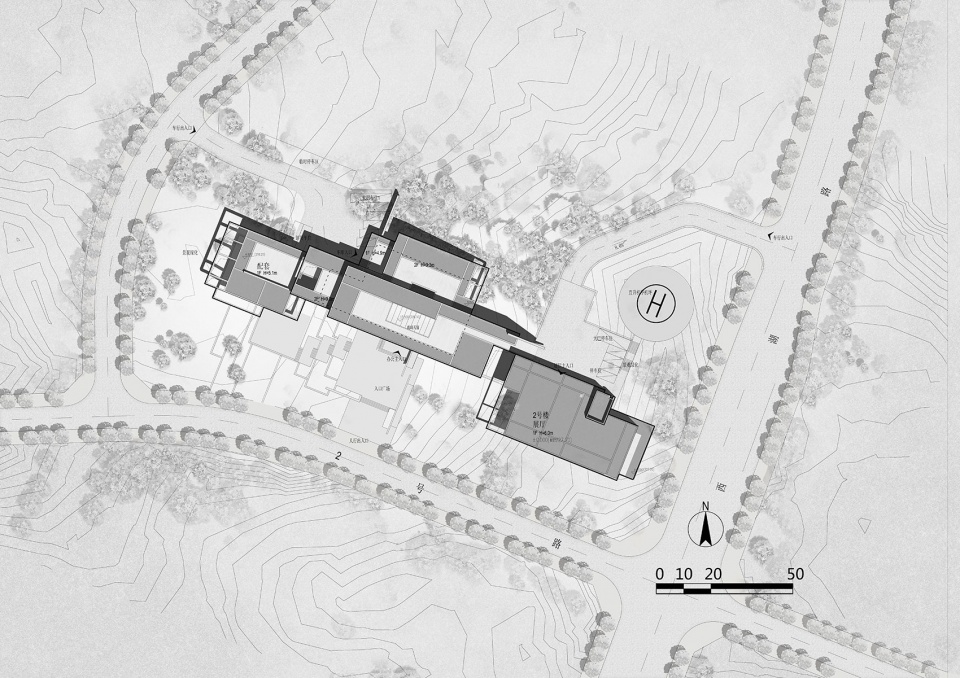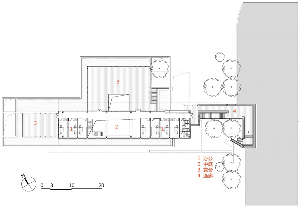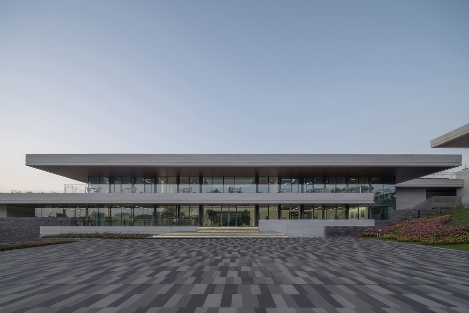 我们将餐饮服务,办公,展厅三个功能组团根据功能属性,沿山势标高错位布置,最大限度减少土方调整,同时每个功能组团景观视野互相不遮挡,下一层的屋顶同时也是上一层的平台。