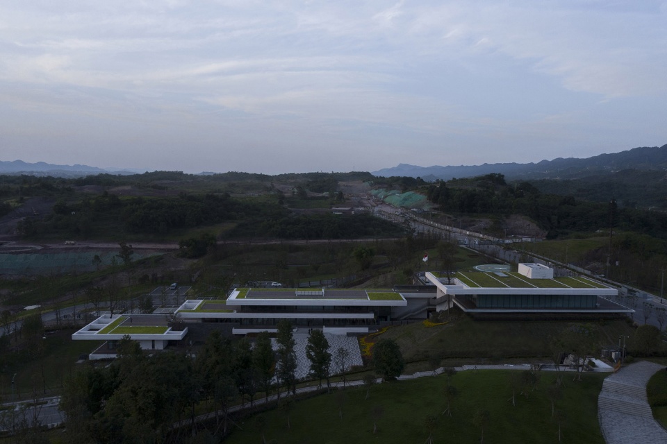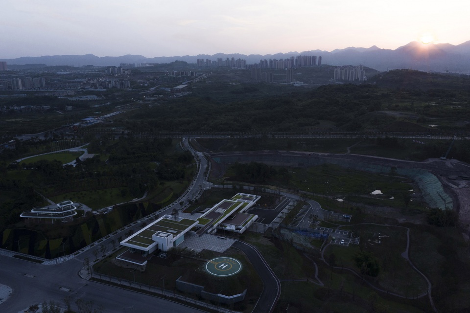 重庆作为一座山城,山地是最重要特征和载体。我们从一开始就摒弃传统的削峰填谷处理方式,而是以山地作为营造元素,采用“顺势营造”的设计理念,通过与山地共融的方式来探索空间和体验的新可能。项目位于两江新区创新区,为新区建设指挥中心提供办公,餐饮,展示等功能,面积约3000平方米。基地位于局部制高点,东面临湖,三面俯瞰新区全景,景观资源绝佳。东侧主要道路,南侧西侧为次要道路,用地几何形态狭长,场地落差高达20多米。