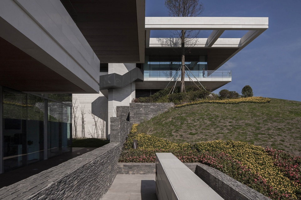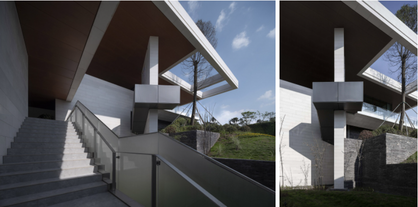 重庆大部分铅灰色阴郁天气,灰色和深色在这个环境下容易给人压抑的感觉,因此主材颜色选择偏白色调的仿石混凝土,既低调稳重又彰显存在感,竖向实体采用深灰文化石,粗犷的质感与山地融为一体,同时与细腻的白色主材形成有趣的对比。