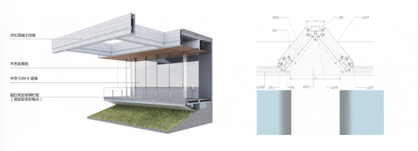 我们希望呈现纯粹而低调的建筑特质,而不去过分炫耀立面。挑檐作为主要表现元素,采用白灰色混凝土挂板,横向采用错缝,竖向企口密拼,增强立面的体量感,凹槽划分弱化尺度,减少挑檐厚重感。