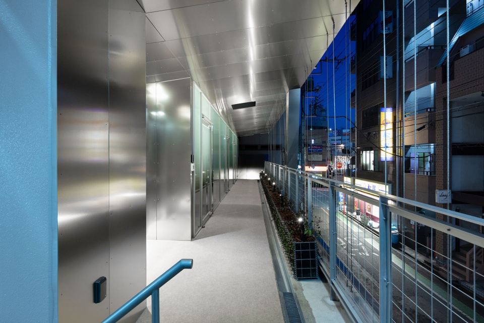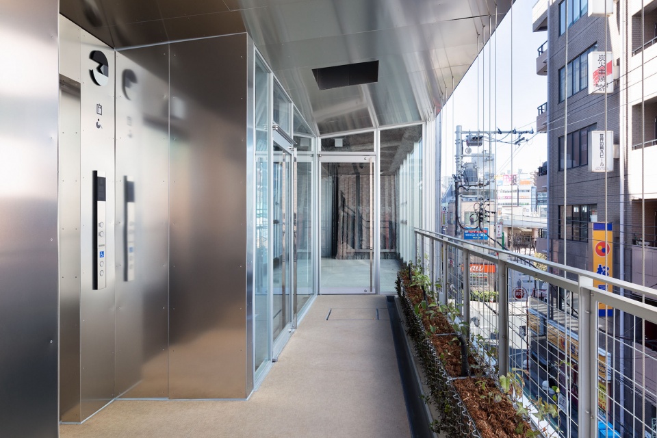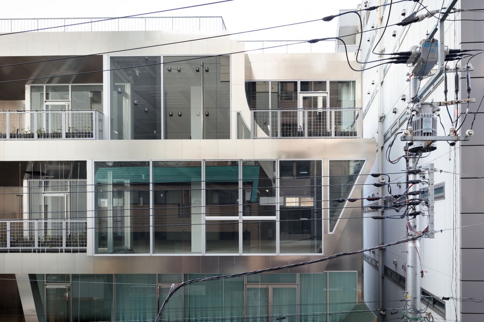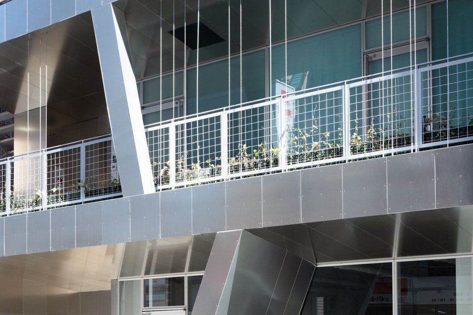 建筑以彩色镜面铝板立面融入通往志木车站的商业街,作为该地区新时代的起点。其正面三层阳台的大小和形状各不相同,赋予立面变化的效果。阳台表面采用与立面相同颜色的铝板,映出建筑内外人的活动。藤蔓沿着上下层阳台之间的线杆向上攀爬。立面以标志性的新形式,引发建筑与彩色铝板之间的互动。