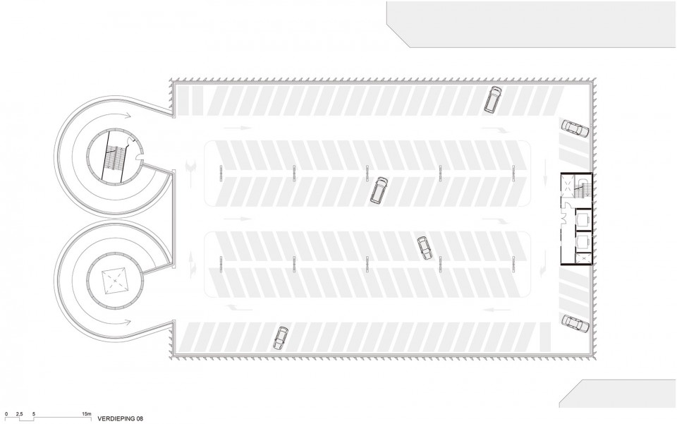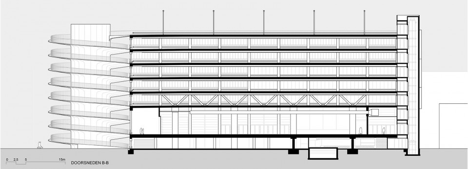这座新型多功能停车场位于阿姆斯特丹Zuidas商区A10环道边,建筑高达30米,有八层停车空间,可容纳约1000辆车停放,其二层除停车之外,还可用来举办会议和展览。当RAI没有活动时,这里可作为公共停车场供大众使用。