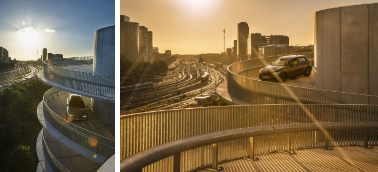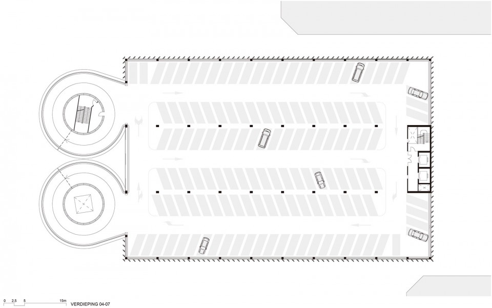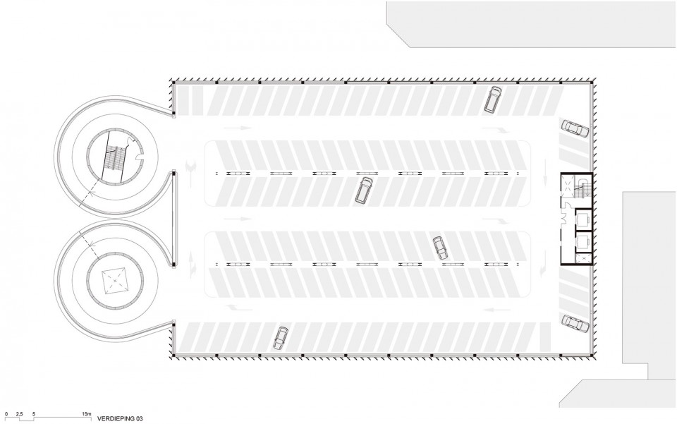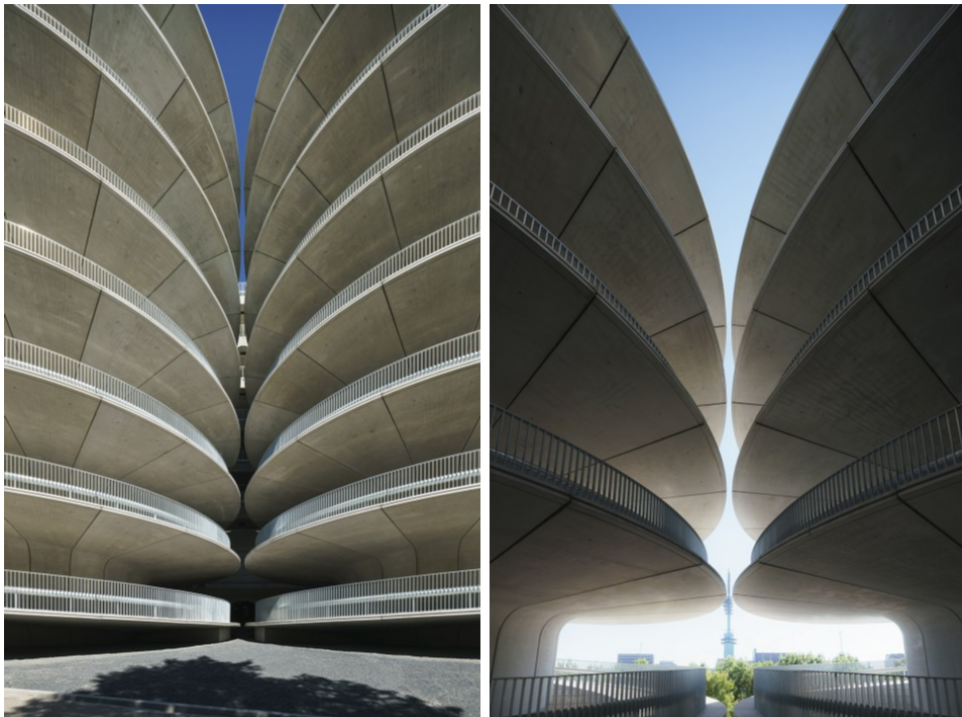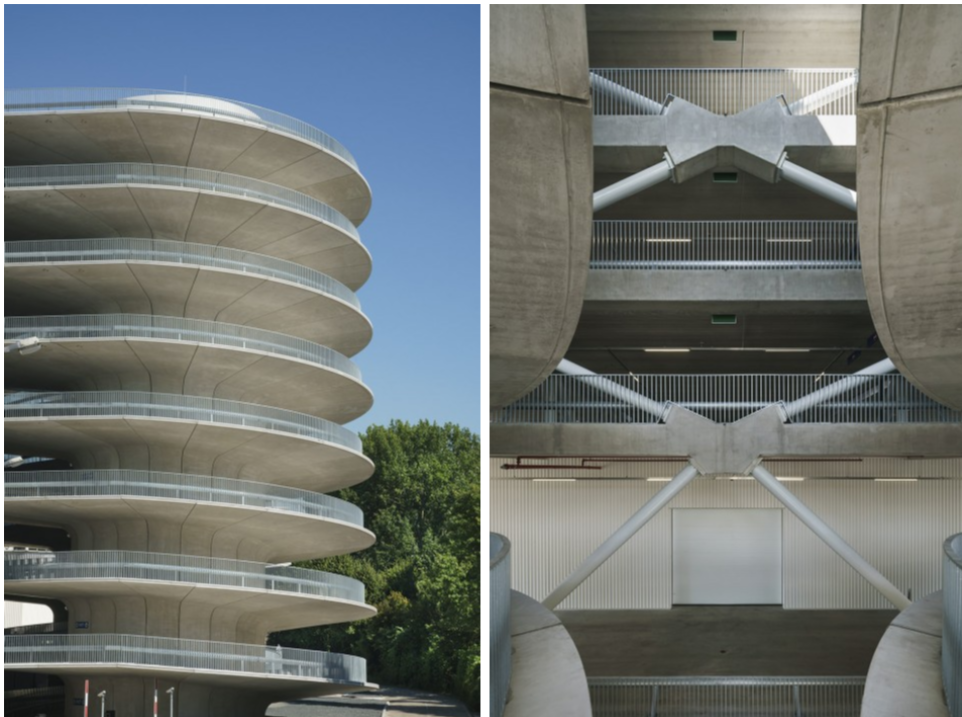 建筑整体为简洁的长方形,在其西端设计了两个标志性的螺旋塔楼,一个用以将车辆引入停车场上层,另一个做为出口让车辆回到街道。阿姆斯特丹RAI车辆繁多,这样将进出的车辆分流可以大大提高停车的效率。塔楼由预制混凝土构件建造而成,两个巨大的螺旋体相对而立,成为了A10沿线的标志性建筑。夜晚这里会被蓝色的LED灯光点亮,其优雅的螺旋形态会变得更为引人注目。