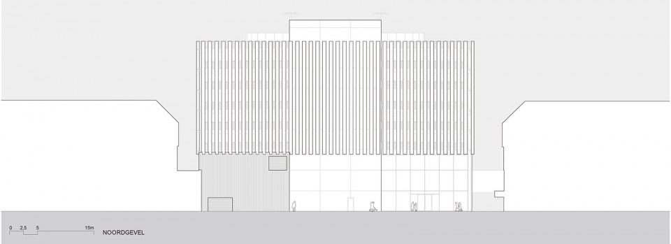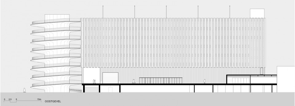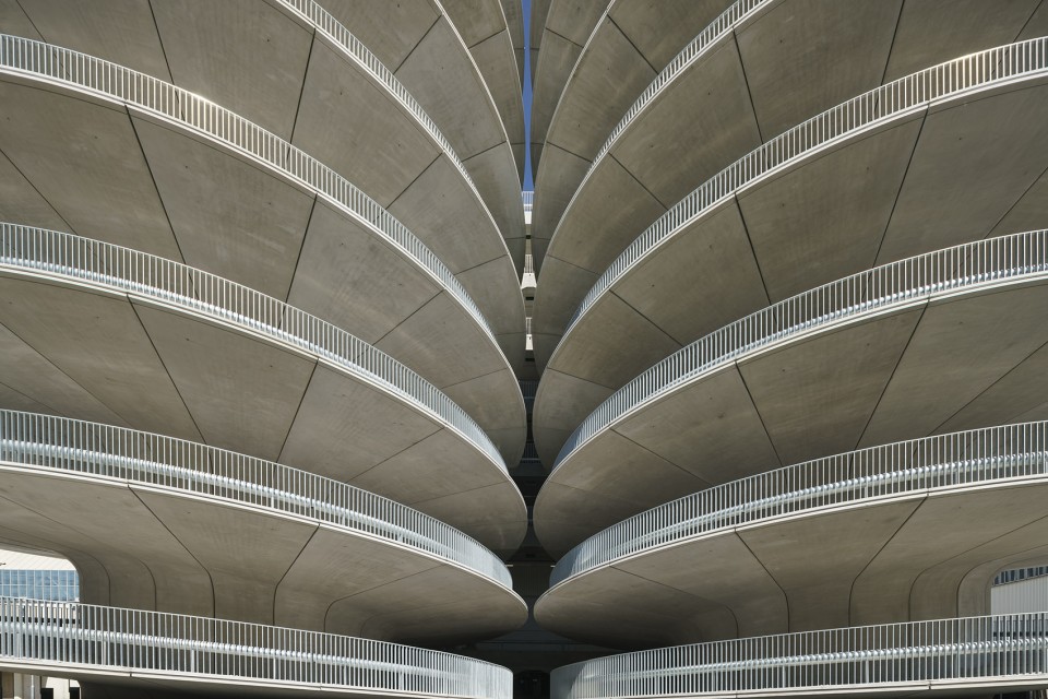 停车场立面由竖向薄板构成,这一元素在RAI的建筑中被多次使用,是综合体建筑之间的一种外在联系。停车场立面的铝制薄板间隔设置,使建筑既通透又保持了一定的私密性;薄板间的空隙让风可以流入建筑,避免了机械通风的使用;而薄板的角度和朝向还可以达到遮雨的效果。