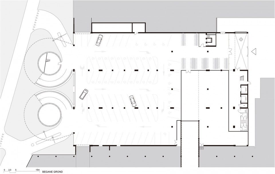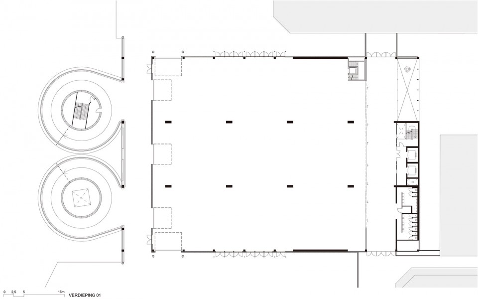 这里不仅可以作为独立的停车场使用,还可以用来举办会议和展览。停车场二层有7.2米高,是其他停车层高度的两倍,整个大厅约有2800平米,其柱网尺寸为7,5米,这样大的尺度减少了空间中支撑结构的数量,使空间更为宽广,人们可以在其中安排不同活动功能。整栋建筑包含三个跨度为15米的中厅,可用作单独的活动空间,而当滑门拉开时,扩展展厅便与RAI主会场连接在了一起。除了一层,上层的停车场和屋顶也可供不同活动使用。