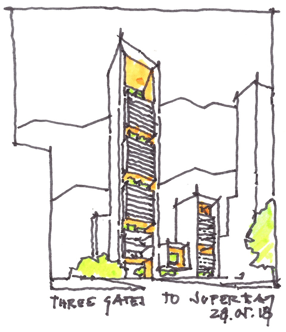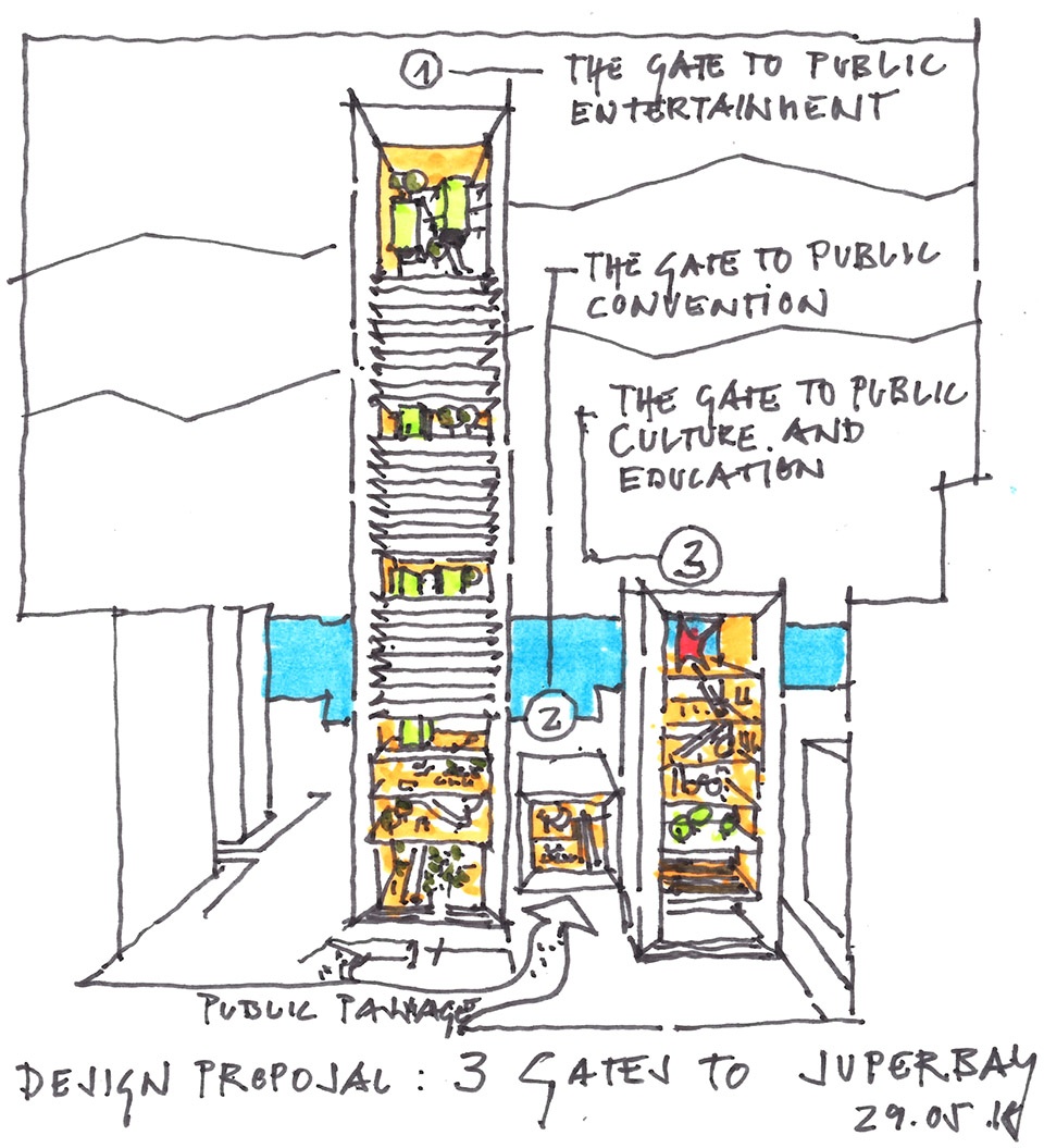 办公塔楼高45层,交通核心位于建筑中央。垂直方向每隔八层设置一座三层高的“空中花园”,兼面向办公楼访客开放。这些开放的区域内设有咖啡厅、书店和健身房等公共功能,塔楼顶部还设有一座观景平台。文化塔楼也采用了相同理念,方案还提出了在其中布置开放庭园和雕塑花园的设想。高八层的塔楼东西立面设有两组交通核心。室内空间宽敞,挑空两层,净高可达9米,是举行展览的理想空间。办公塔楼和文化塔楼之间紧凑坐落着六层高的会议中心。一座富丽堂皇的大堂区域围合中央礼堂布置。屋顶上设有屋面花园。