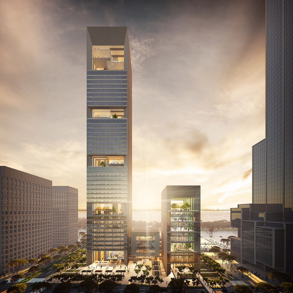 “深圳超级湾总部基地”作为深圳市内最后一片集中开发的地段位未来将发展成为一个崭新的商务区,世界500强企业恒力投资集团办公大楼正坐落于此。gmp·冯·格康,玛格及合伙人建筑师事务所的设计的中标方案为底部相连的三个体量组成的建筑综合体,250米高的恒力国际大厦办公塔楼从综合体中脱颖而出,会议中心、文化和商业功能围合于四周。通透明亮的“空中花园”作为公共休闲区域,垂直分部于塔楼内部,为高耸的建筑划分出节奏感。