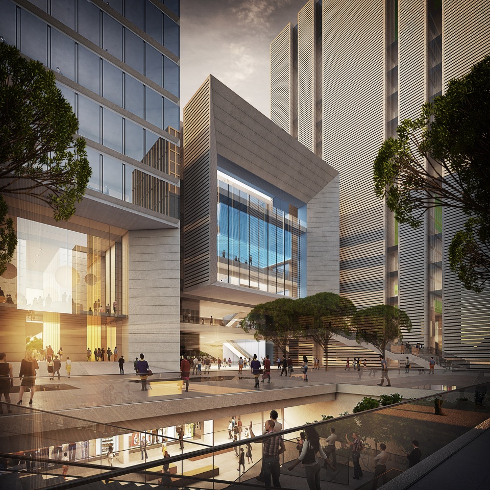 三座高层建筑的底部六层相互连通,构成一个水平层面上的功能区域。地下为建筑群的基座,地下一层和二层内设有购物中心。北面设有一座大型社区广场,花园景观点缀其间,参差错落的小径、栈桥和小广场营造出高品质公共休闲空间,也刻画出通往恒力国际大厦的入口区域。