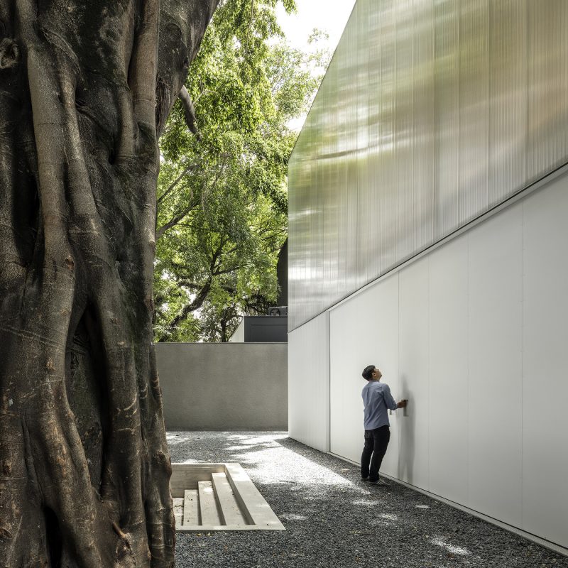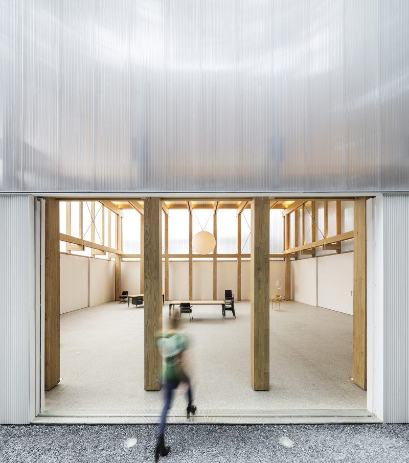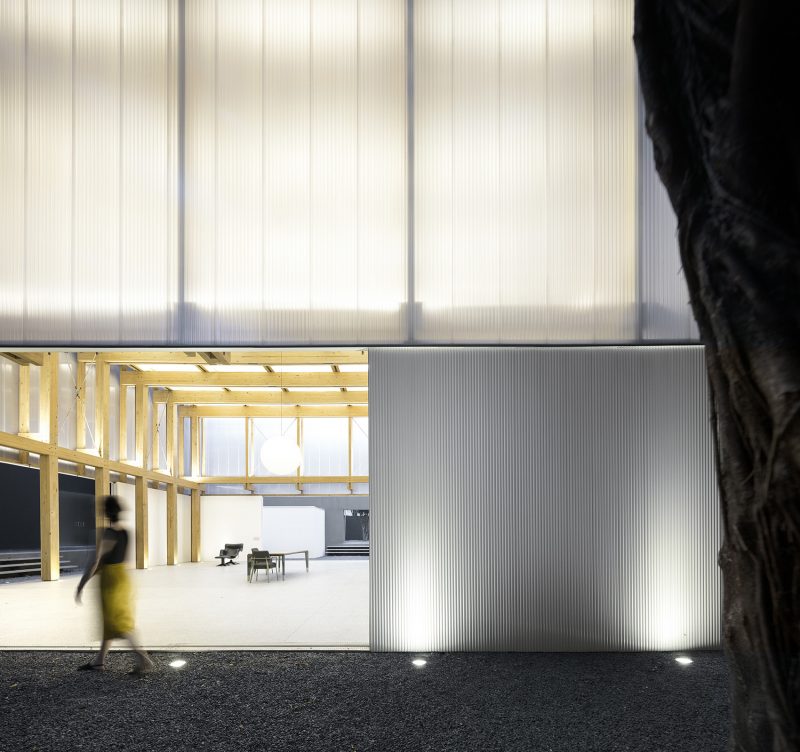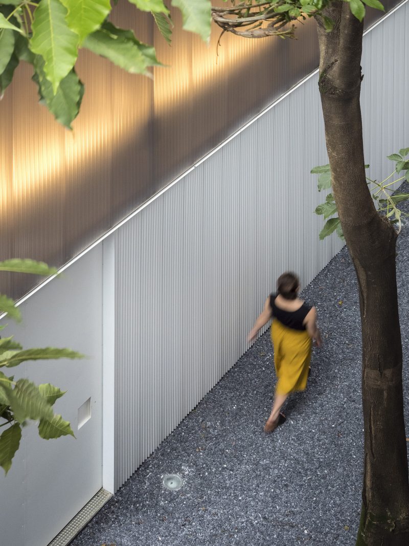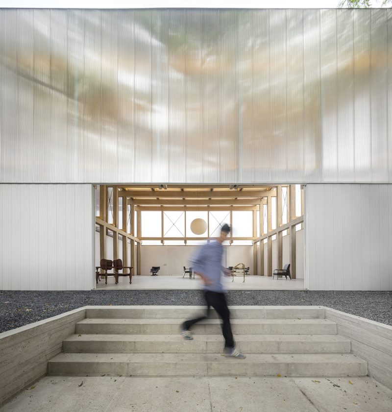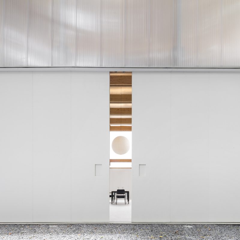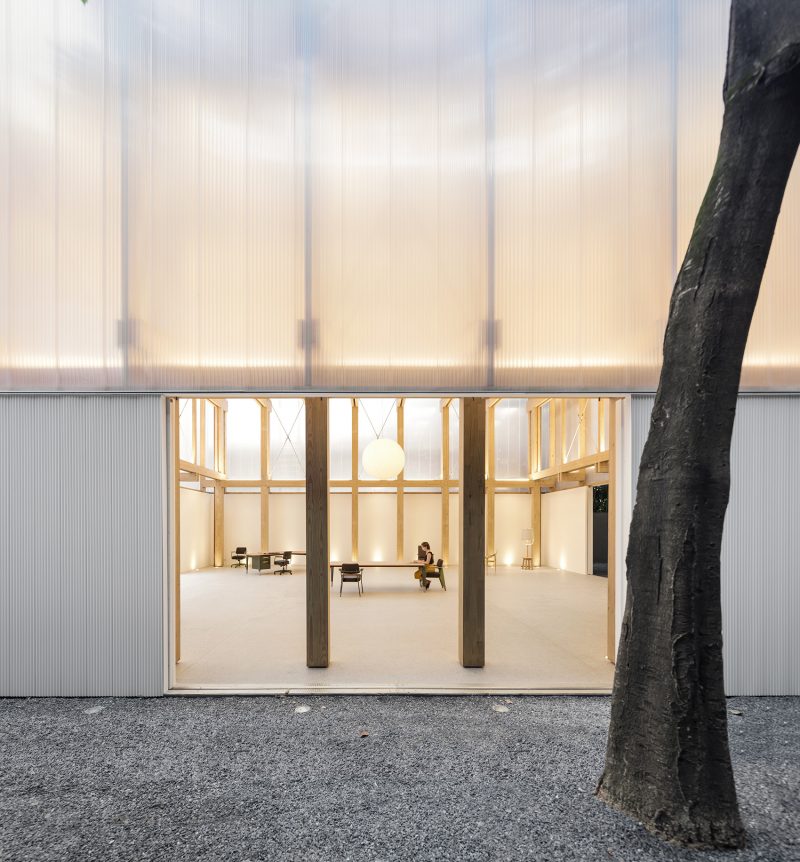 相比于A栋建筑“笔直”的钢结构以及B栋建筑粗犷且裸露的混凝土结构,C栋建筑如同一盏日式的灯笼,轻轻地漂浮在地面之上。建筑的外墙由两种材料折叠而成:上方使用了半透明的聚碳酸酯板,下方则使用了白色的金属板材。在白天,周围的树木在立面上投下阴影,为室内空间带来诗意的光影变化。