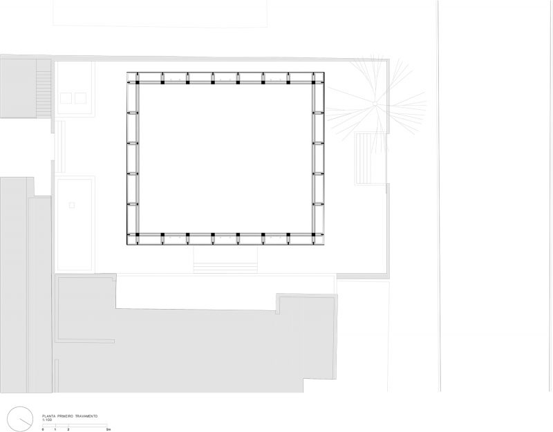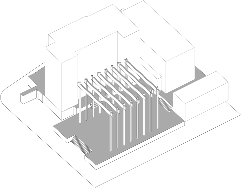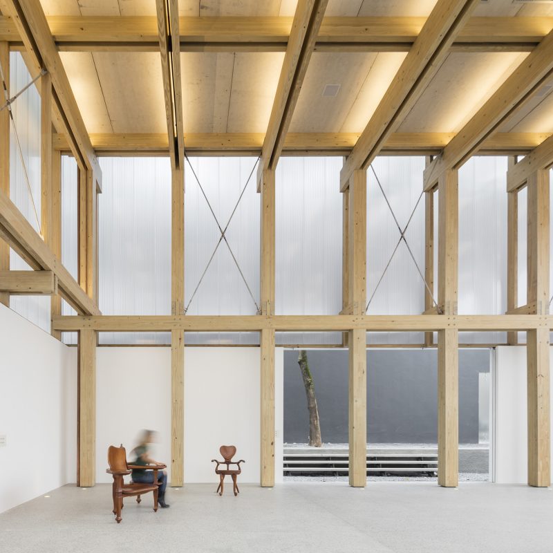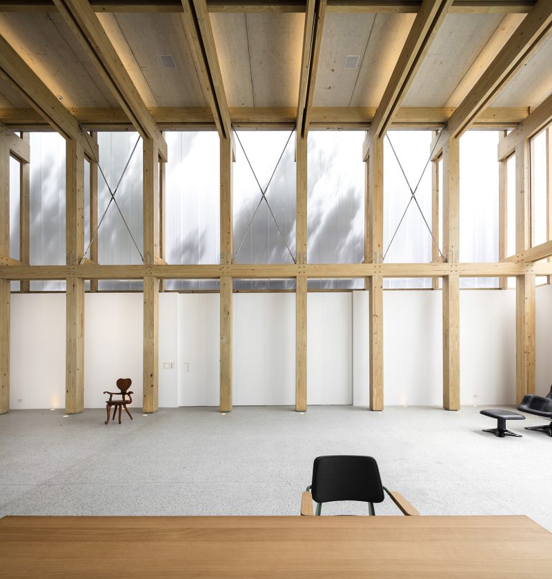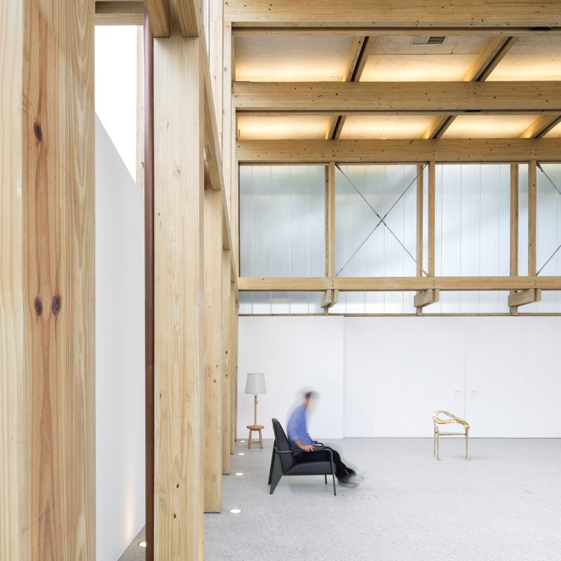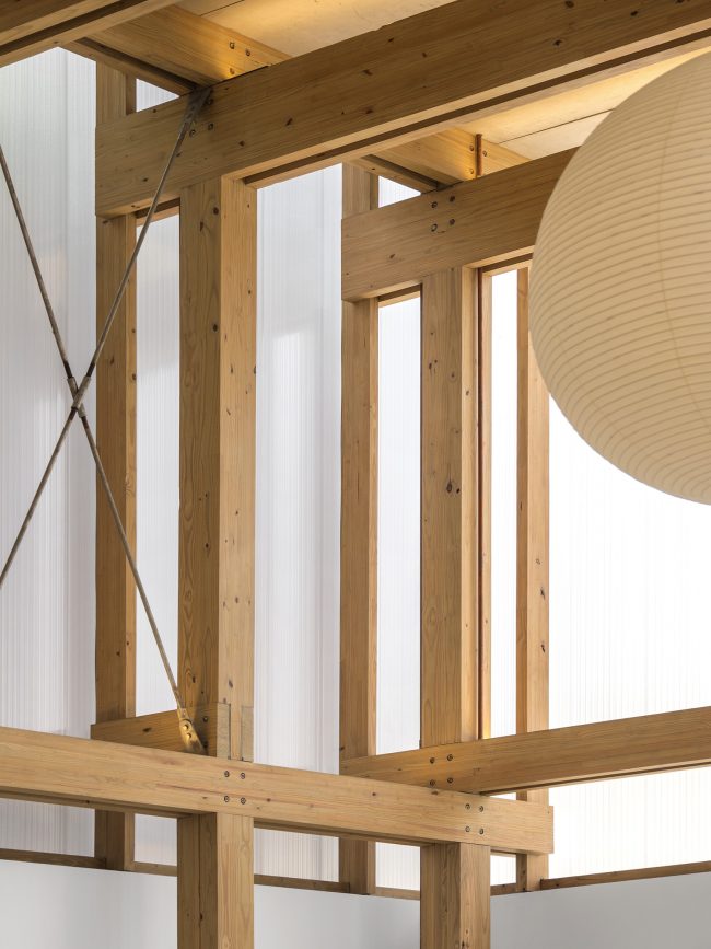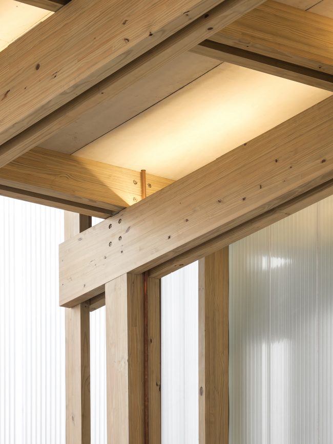 为了建造一座轻盈的展馆,设计师采用了木结构系统,在延续事务所近期实践研究主题的同时,也实现了干净且迅速的施工过程。一系列胶合木框架为建筑赋予了大约15米的跨度。在二层楼板处,每两个模块会使用钢条进行一次支撑。下层结构支撑了建筑的表皮,在立面和立柱间形成间隙,从而带来更加明显的韵律感,凸显出木结构元素的简洁特质。