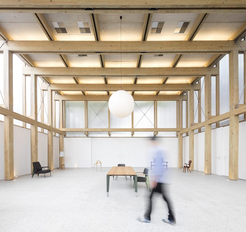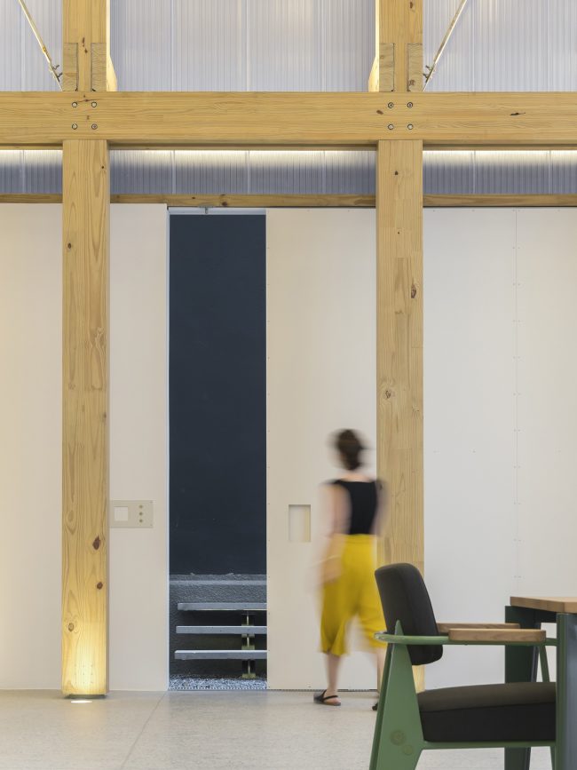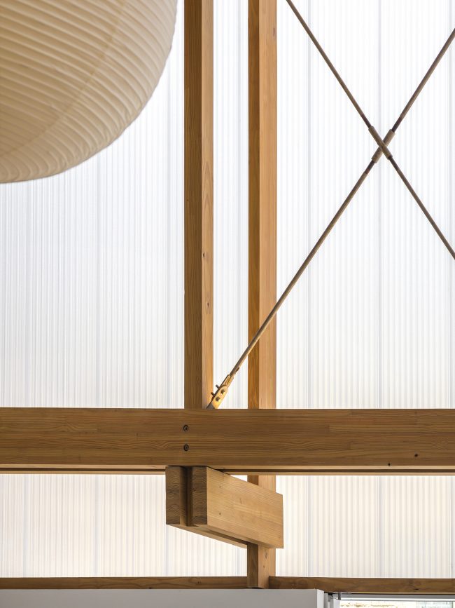 ▼一系列胶合木框架为建筑赋予了大约15米的跨度