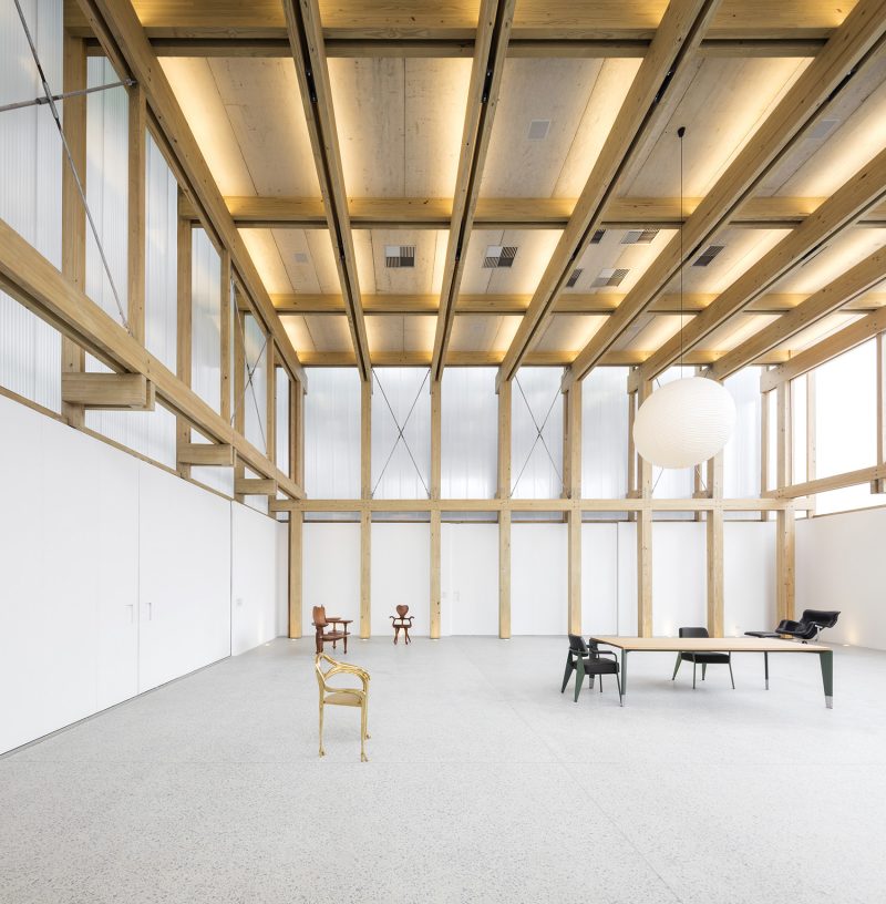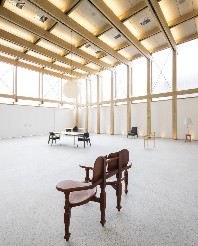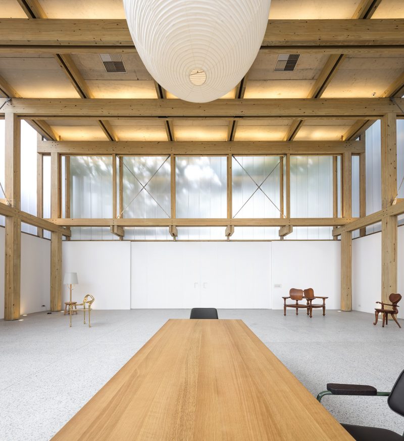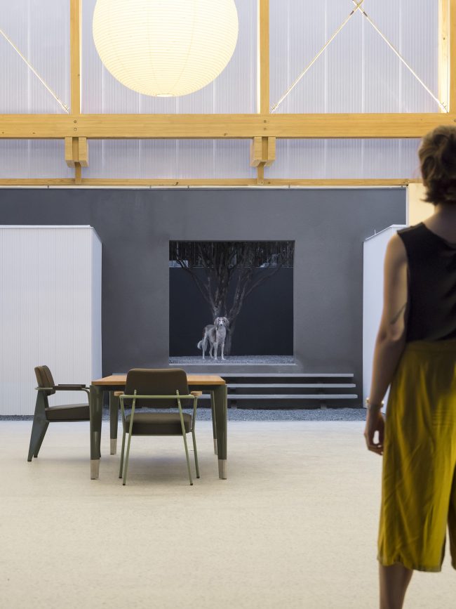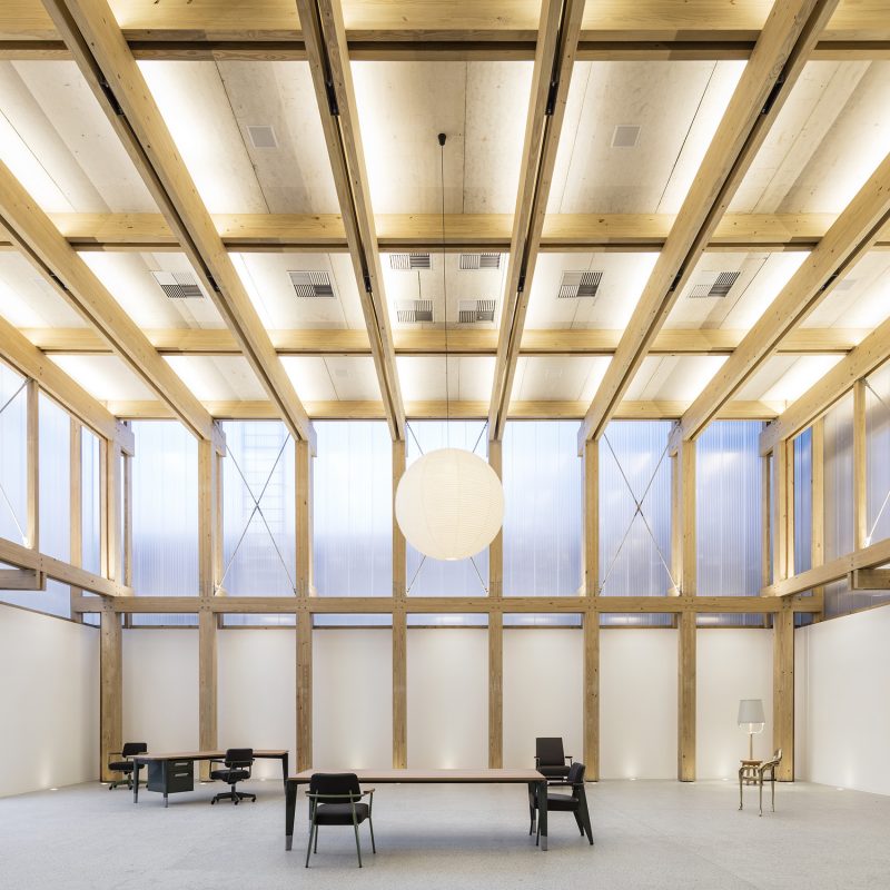 多功能的内部空间满足了灵活的布局需要,兼具了商店、展览空间和艺术家临时住所的功能。所有的空间均集中在一个宽敞的体量之中:15x15m的楼层面积,以及7.5米的天花板高度。双层高的对称中庭空间悬挂着野口勇设计的吊灯,凸显出室内空间的纵向维度。