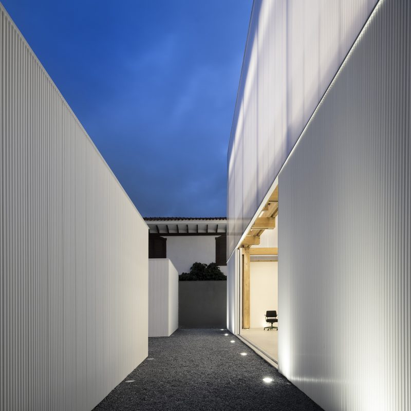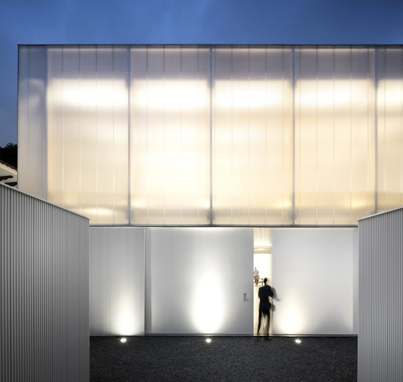 ▼建筑立面由聚碳酸酯板和白色的金属板构成