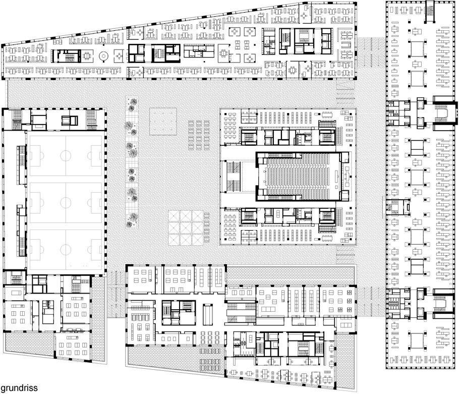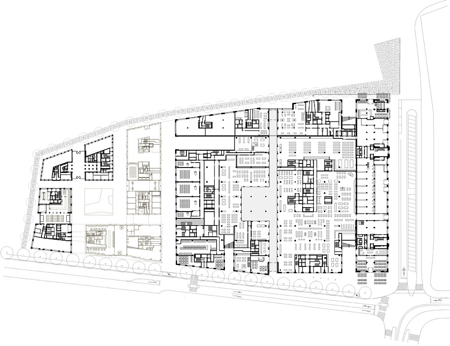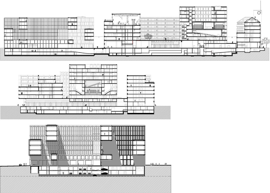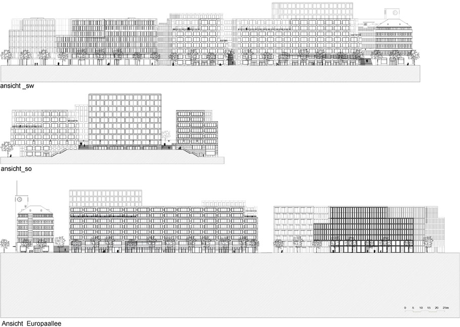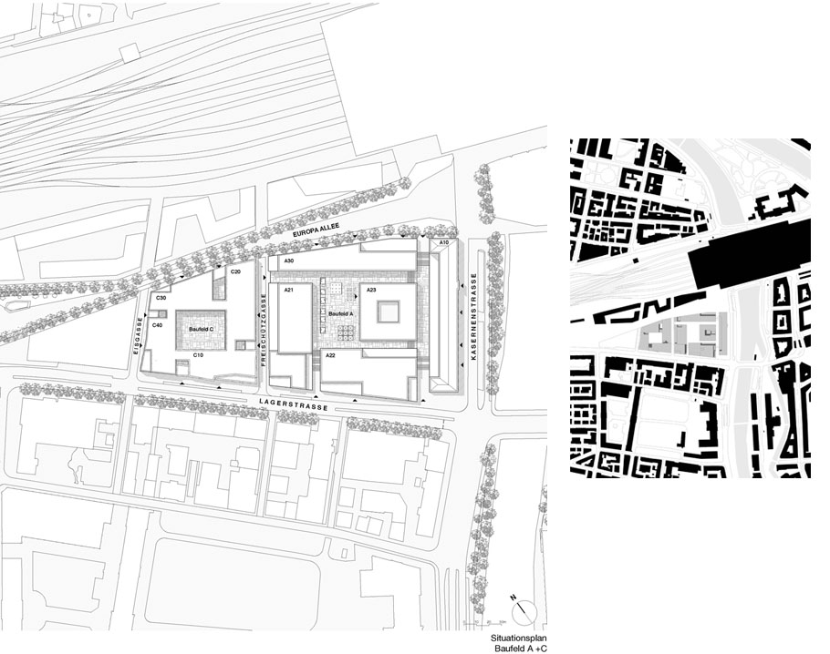 建筑工地A与它的Alt SiHLPOST和教师教育大学的竞争,以及建筑工地C与瑞银银行大楼,是同类产品中的第一个。你认为这场比赛对欧罗巴莱的出场有决定性的影响吗?的确,我相信我们第一阶段的解决方案对随后的建筑工地产生了连锁反应:对它们的节奏,它们的核心。许多其他参赛作品设想的建筑工地A的完整建筑与教师教育大学。我们建议把大学校园建在一个凸起的广场上。我们沿着Kees Christiaanse在总体规划中所规划的原始路线,并通过增加更多空间和通道对其进行了扩展——现在,城市中终于有了真正的广场。城市空间的连续性也保持不变。一切都是公开的。考虑到欧洲城市的未来发展,我相信,随着时间的推移,开放空间在城市规划中比一栋孤立的建筑更重要的理念将会盛行。在这个过程中,我们也学到了新的东西。建筑工地A和C的构思是同时进行的,因为以前位于这里的邮政分拣办公室占据了如此巨大的面积。我们意识到这个空间对于任何一个建筑师来说都太大了。这就是为什么我们建议建筑公司David Chipperfield和Gigon/Guyer(他们也参加了比赛)也为建筑工地C提供建筑。这被证明是成功的。