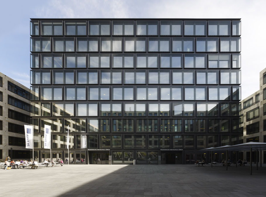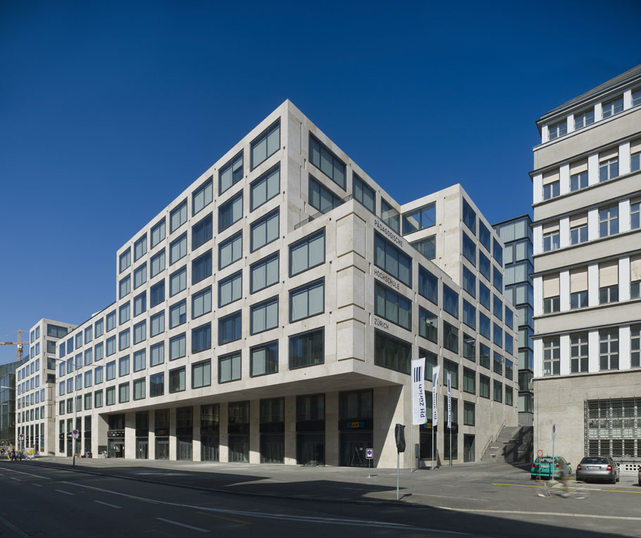 马克斯·达德勒将新欧罗巴阿莱区的建筑分为两个施工阶段。在建筑工地A,直接在Siell邮政大楼后面,一个三个建筑物的集合正在为苏黎世的大学教师教育建立,连同额外的办公室和商店设施。该建筑群是欧罗巴阿莱区建造的第一座新建筑,于2012年秋季竣工。这所大学的高架中心校园是通过一组比例相当大的外部台阶到达的。中央区域将乐团的主要玻璃建筑与南面的建筑相连,南面的建筑内有研讨会室和托儿所,西面的建筑内有工作室和音乐室,最高层有两个体育馆。广场北侧是一栋办公楼,也是由马克斯·达德勒设计的。在演讲室、大学食堂和图书馆的下方建有一座购物中心,其中包括一条通往地面火车站的通道。建筑群的立面以砖石建筑的简洁和优雅为视觉导向。深邃的阴影将大型玻璃和特罗塞尔费尔斯石灰岩立面元素分隔开来。通过部分投影和凹槽,该建筑的正面既有雕塑感又宁静,视觉上也一致。其玄武岩表面细节无缝延伸至相邻的门厅和食堂。