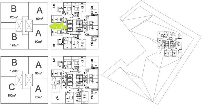 在这种情况下,从地块的外侧切割出一个14米的大条带,然后进行挤压,以获得符合城市背景的比例。在这14米的内部,我们可以很容易地画出一些带有两侧立面的房屋,包括自然通风,以获得最佳的热性能。然后,根据上下文对这条带进行了建模:桥前的一个环路,主街道的另一个前方,一个以一定角度连接街道一侧和地块背面的孔。这栋建筑被改造成一条蛇,与城市元素共舞。