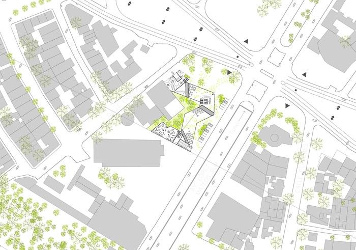街角有一座住宅楼,与大道另一侧的现有住宅楼形成了呼应。