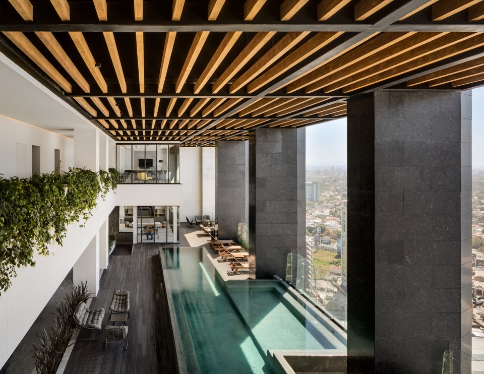 泳池作为住宅设施的中心元素,占据了一个两层楼高的空间,并且有一个朝南开放的露台。多功能室位于建筑的东部,靠近电梯并且从视觉上将露台与Paseo Andares连接起来。
