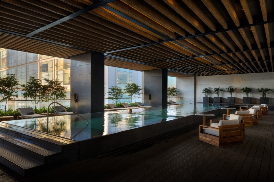 酒店空间从大厅层开始,包括几个零售区、会议室和迷你宴会厅,满足该区域的商业需求。在后续的几层,酒店设施如大堂休息室、酒吧、餐厅和主宴会厅位于大厅上一层,泳池、健身房和专属会员俱乐部位于二层。