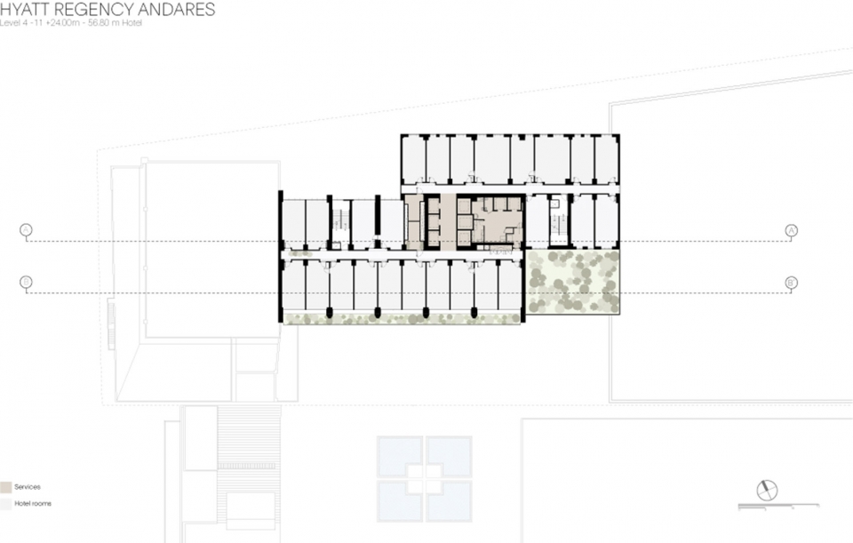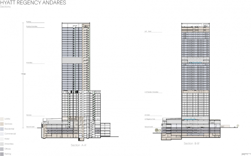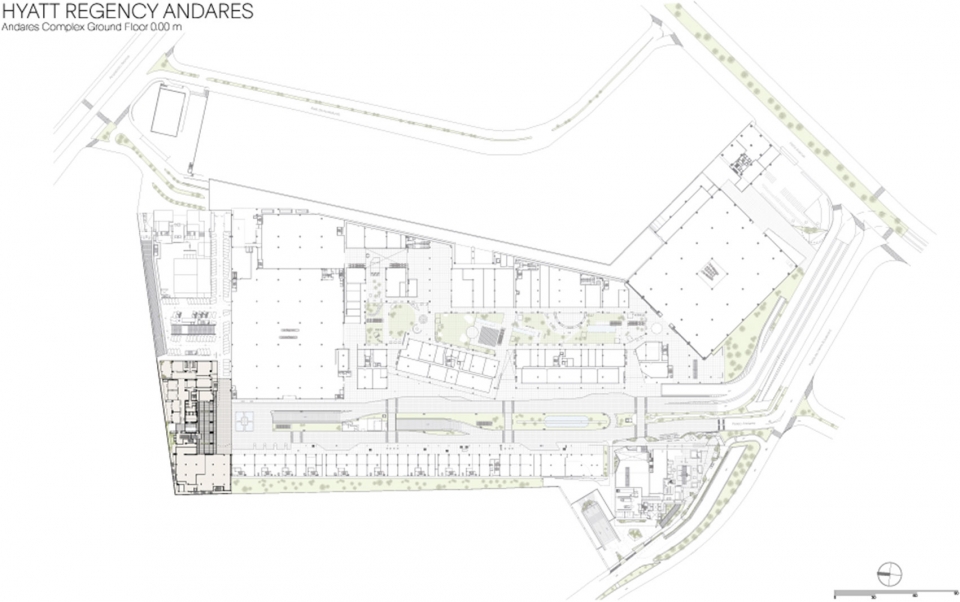 Andares凯悦酒店公寓塔楼为Paseo Andares综合体内部车道提供了视觉和空间背景,车道为综合体内部不同功能区域服务也是城市布局的补充。塔楼从地面起有41层楼。地面层包括一个与综合体内部街道连接的绿荫公共广场,也作为汽车疏散区域。