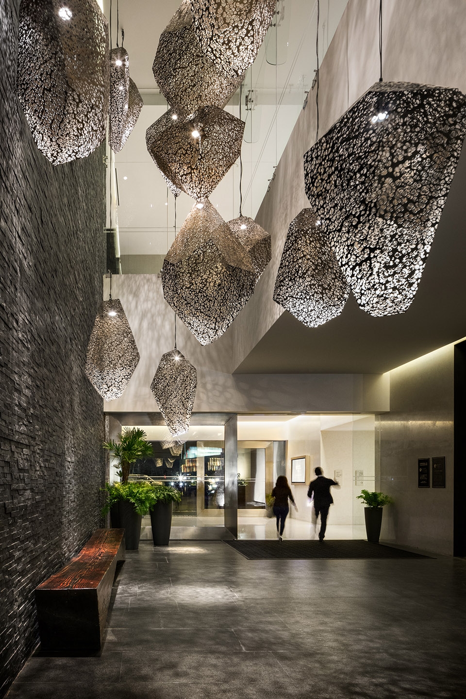 垂直交通核心位于塔楼的东北角,按照用途和容量进行划分,三部电梯用于住宅公寓,三部供酒店客人使用。