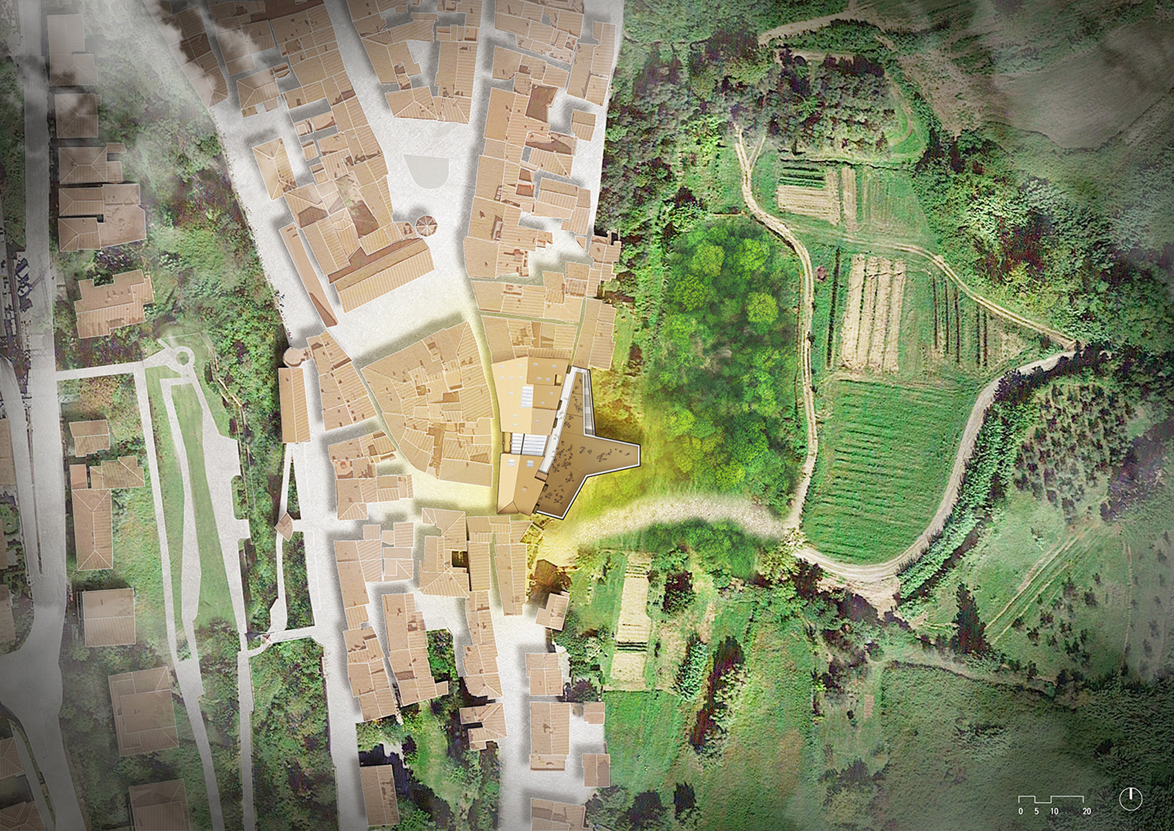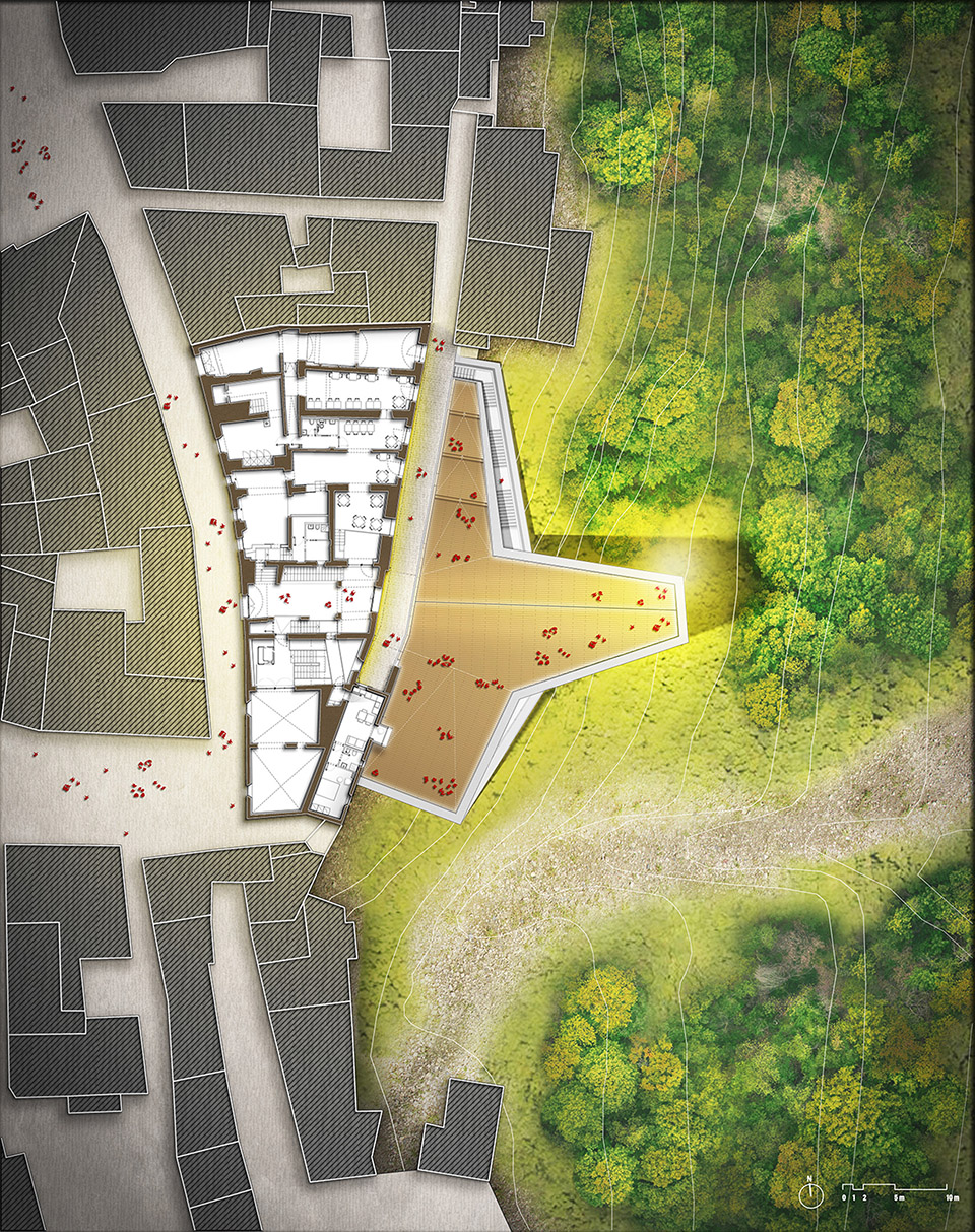 拆除靠山谷一侧被地震损坏的底部建筑,置入一座二层现代建筑,与宫殿建筑群地下部分有机串联。为了将建筑对原始山坡地貌和生态的破坏减到最小,重建方案采用轻质结构,桩基选用最小程度的基础开挖,同时还可节约原料、运输和人力成本。